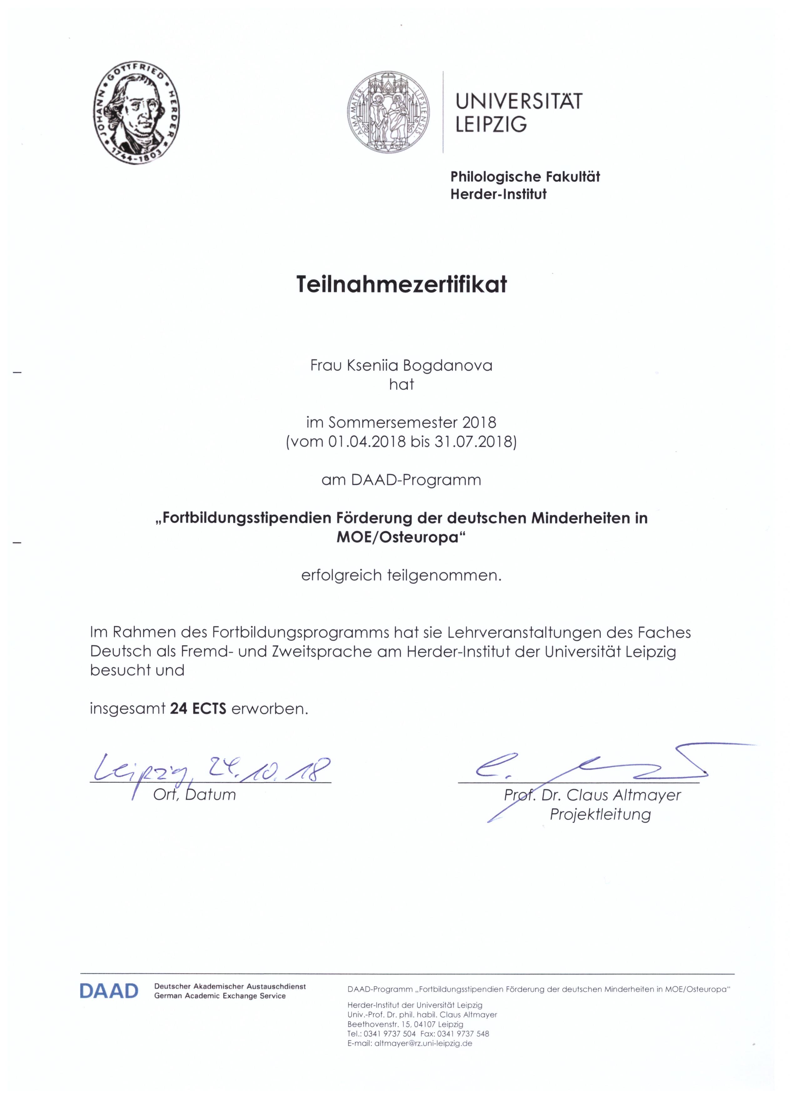 апрель 2018 - июль 2018 - повышение квалификации в рамках стипендии DAAD в Universität Leipzig по программе "Deutsch als Fremd- und Zweitsprache"