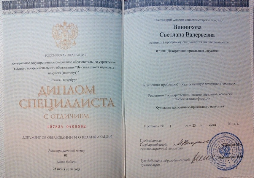 - Образование: Высшая Школа Народных Искусств (институт) факультет декоративно-прикладного искусства, 2014 год, красный диплом.