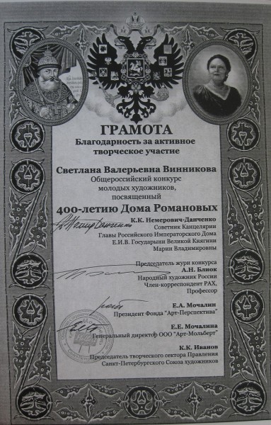 Участник выставок в выставочном центре Союзе Художников СПб, победитель творческих конкурсов.