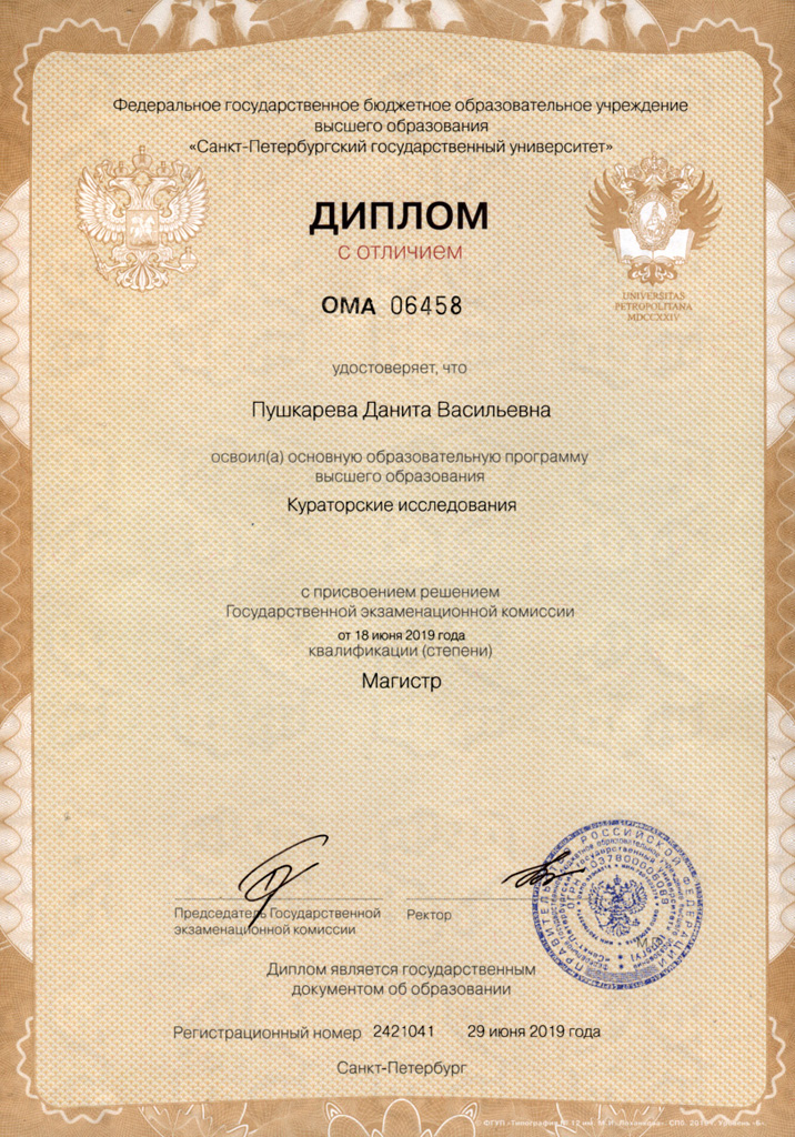 Санкт-Петербургский государственный университет (окончила в 2019 г.) степень Магистр