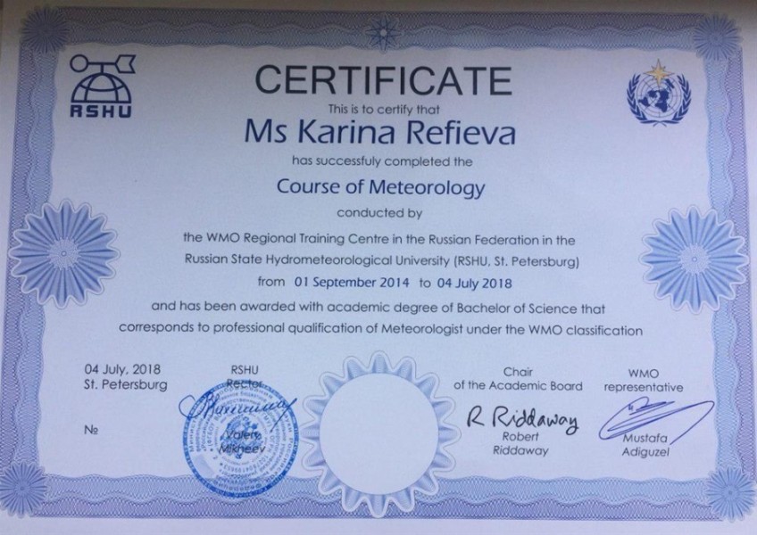 - Образование: РГГМУ, метеорологический факультет, 2018 г.