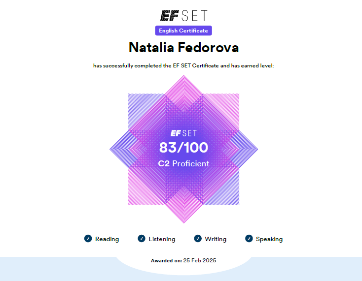 В 2014 году сдала международный экзамен по английскому языку IELTS на 7.0 баллов (что эквивалентно уровню владения языком С1 по системе CEFR).