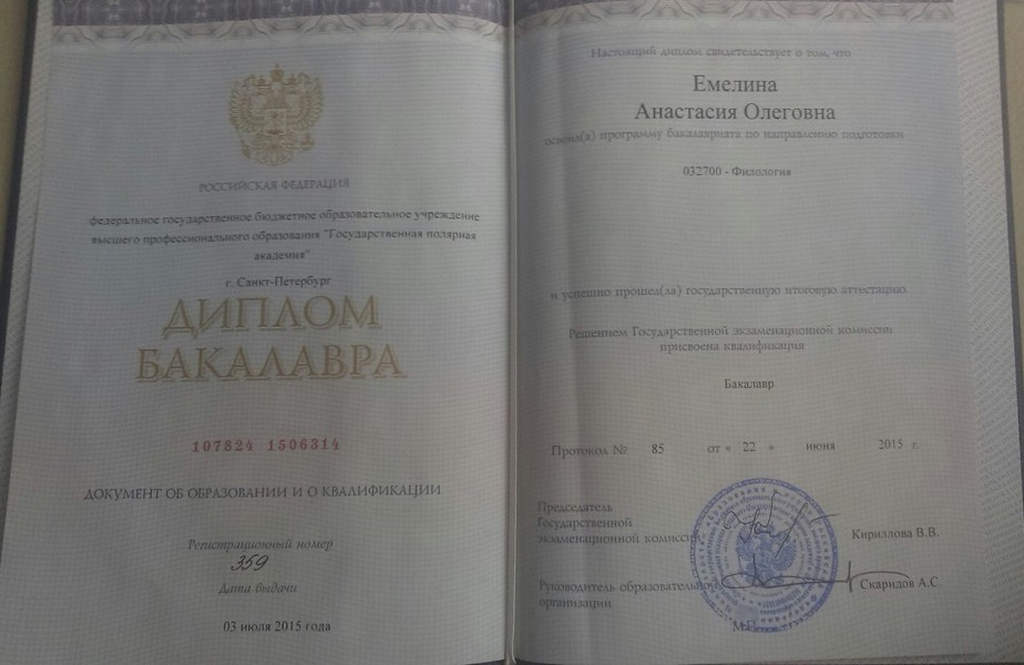 - Образование: РГГМУ (бывш. ГПА), факультет филологии, специальность английский язык и литература, бакалавр. Закончила ВУЗ, когда он еще был Государственной Полярной Академией.