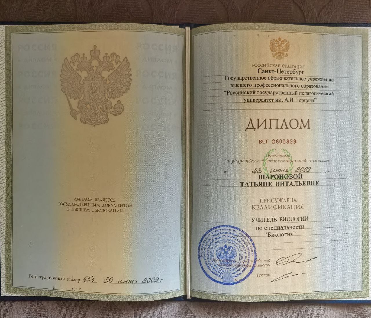 - Образование: РГПУ им. А. И. Герцена. Биология, 2009 год окончания