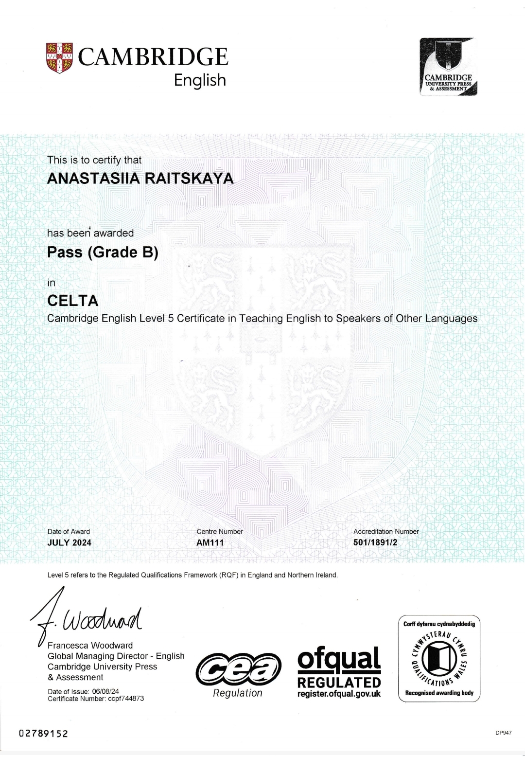 Я преподаватель английского языка со стажем более 5-и лет. Регулярно выезжаю заграницу на стажировки, посещаю различные языковые семинары. Также работаю в сфере услуг, где часто общаюсь с носителями языка.