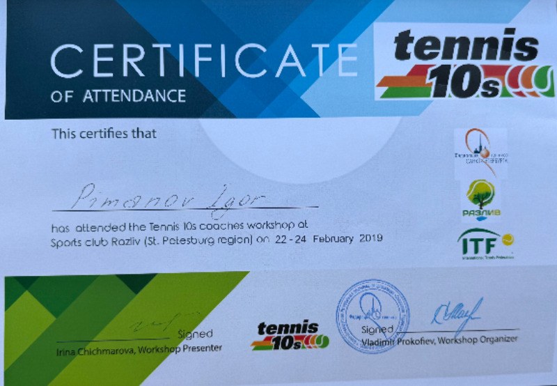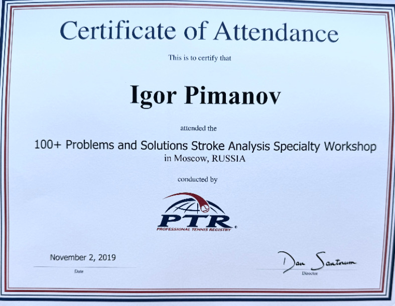 Имею международный диплом тренеров Professional Tennis Registry: квалификация - профессионал.
