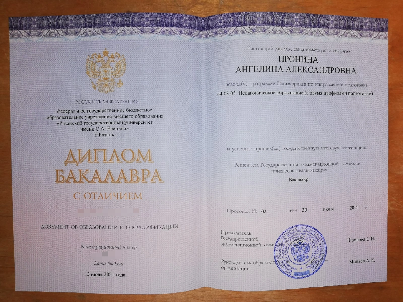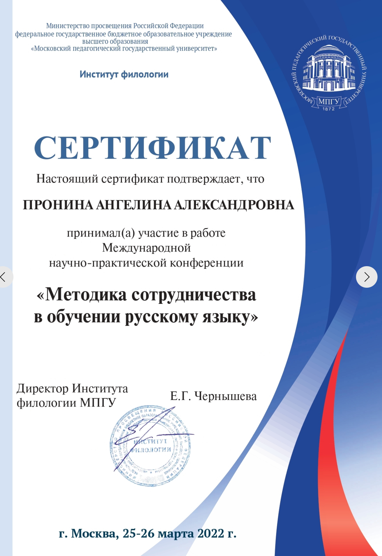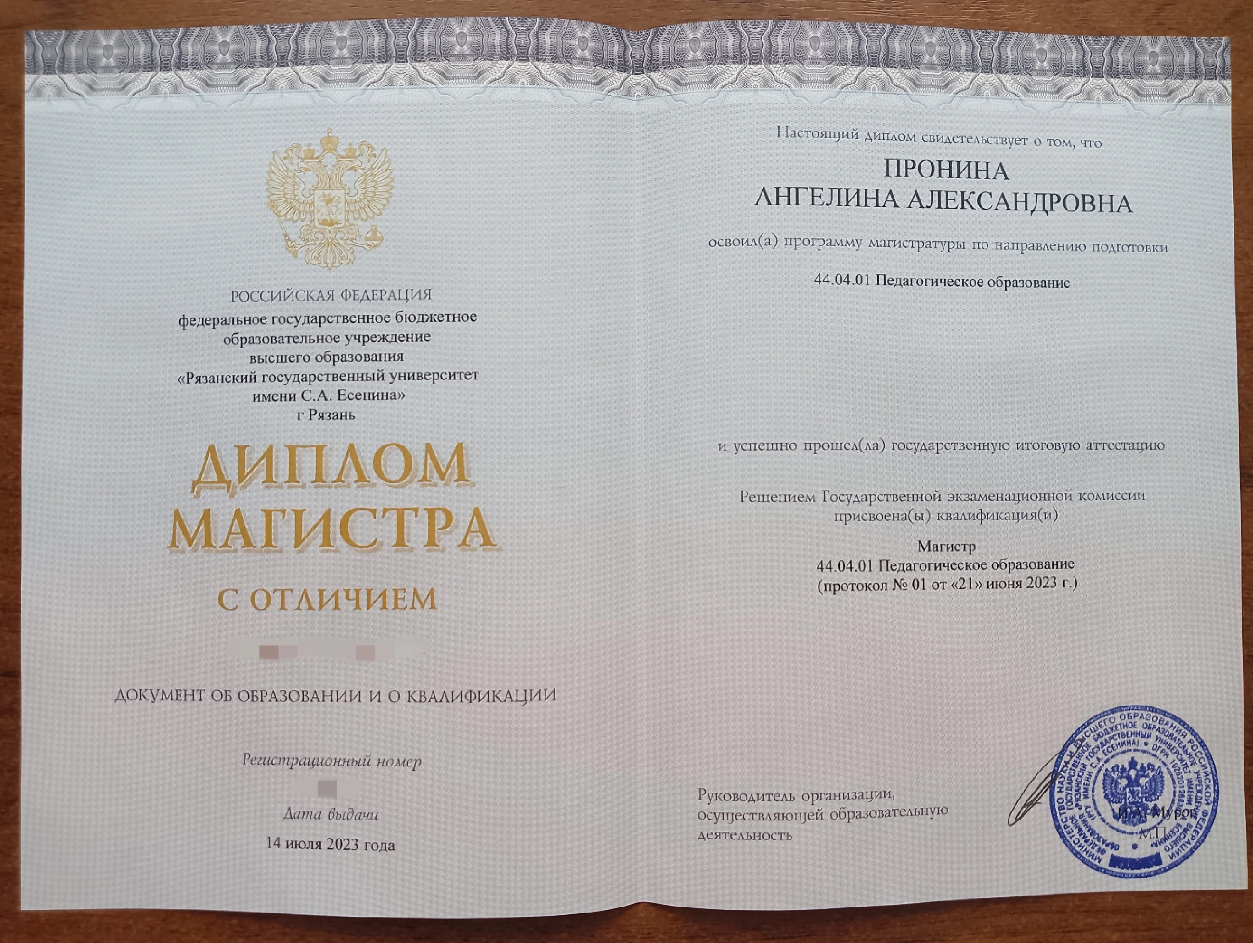 Рязанский Государственный Университет имени С. А. Есенина, «Методика преподавания русского языка», диплом с отличием, магистр, 2023 год.