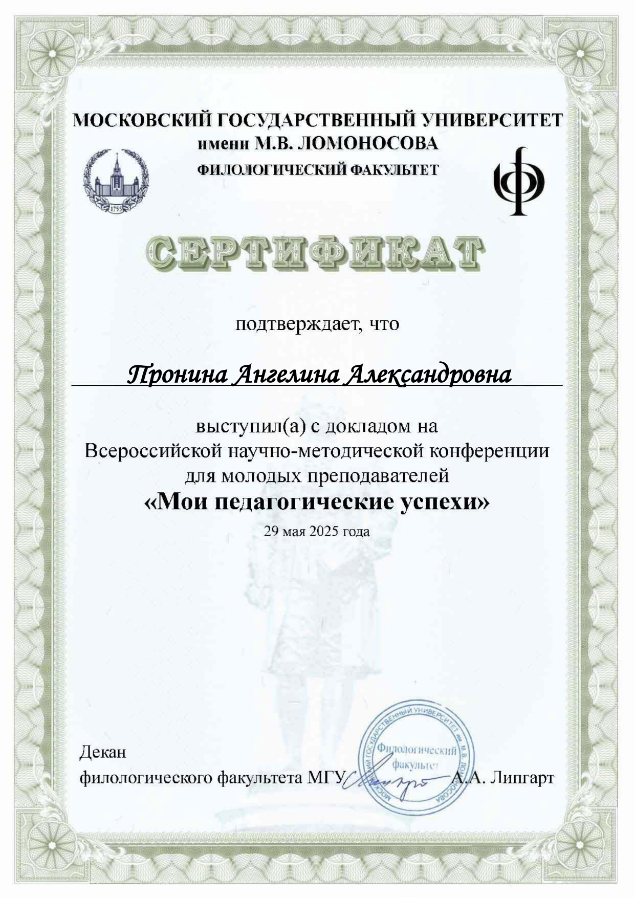 1. Докладчик на Всероссийской научно-методической конференции для молодых преподавателей «Мои педагогические успехи» (МГУ имени М. В. Ломоносова, город Москва, 2025 год).