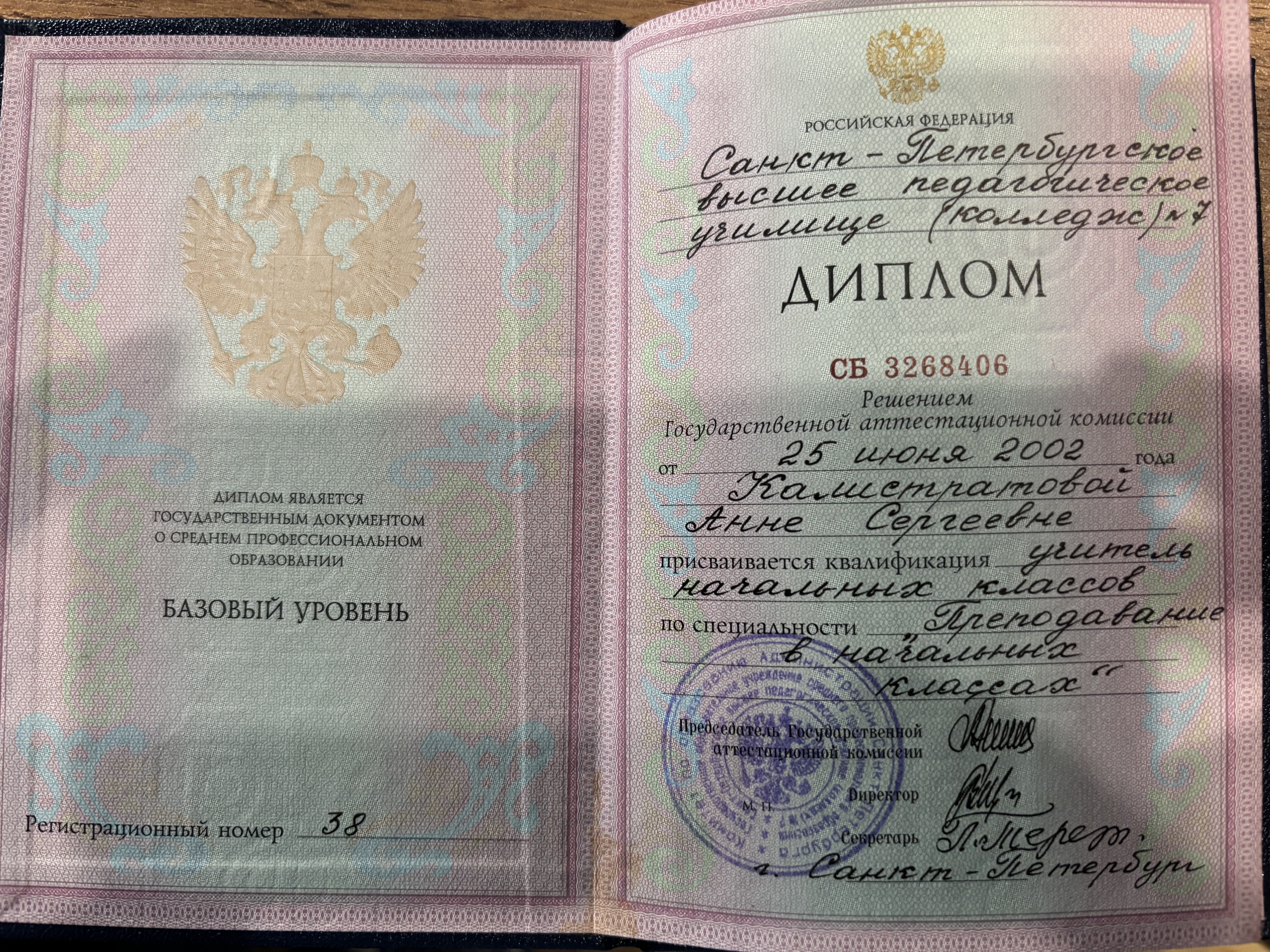Образование: Санкт-Петербургское высшее педагогическое училище (колледж) №7, учитель начальных классов, 2002 год.