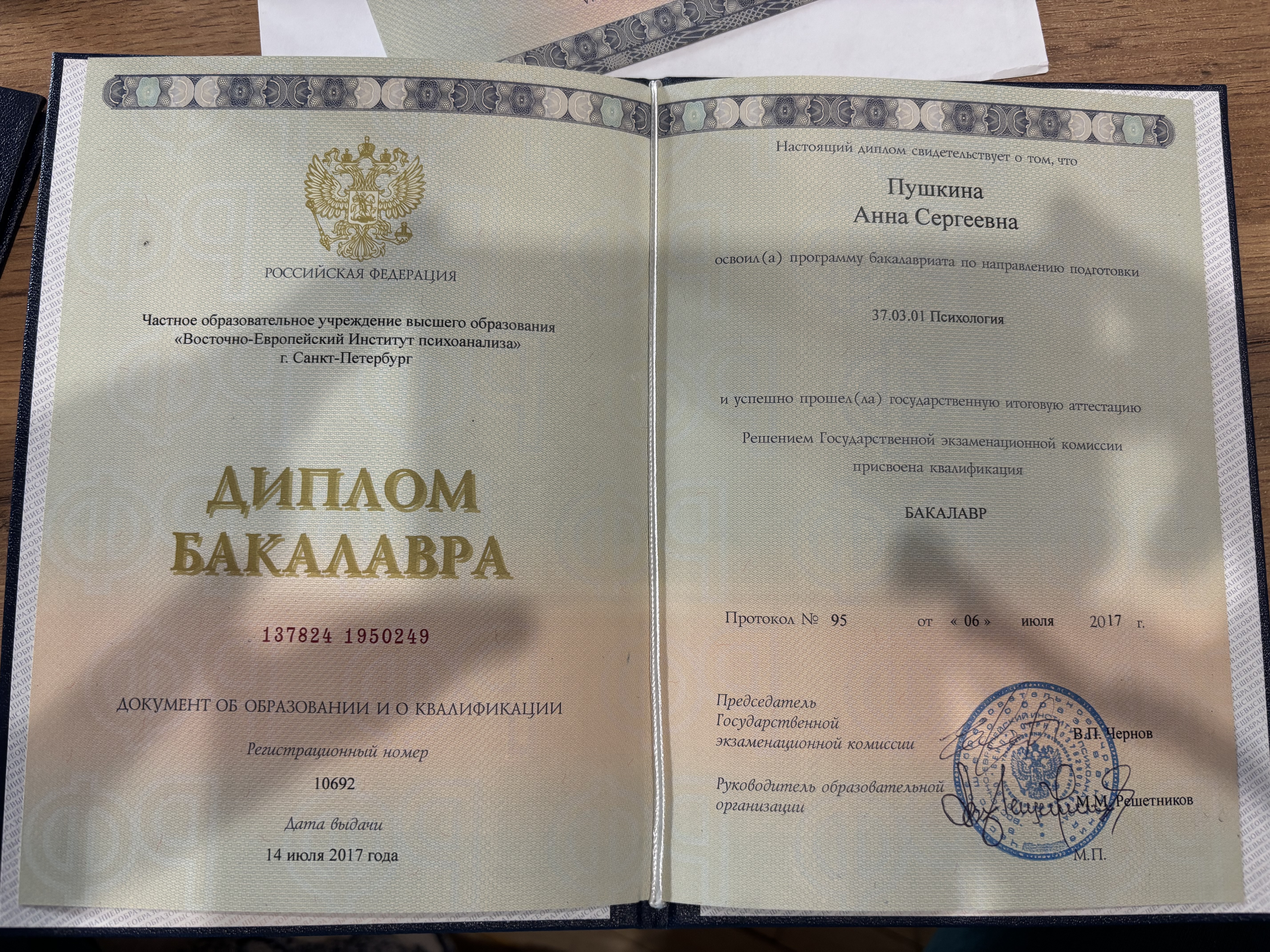 Восточно-Европейский Институт Психоанализа (ВЕИП), психология, бакалавр, 2017 год.