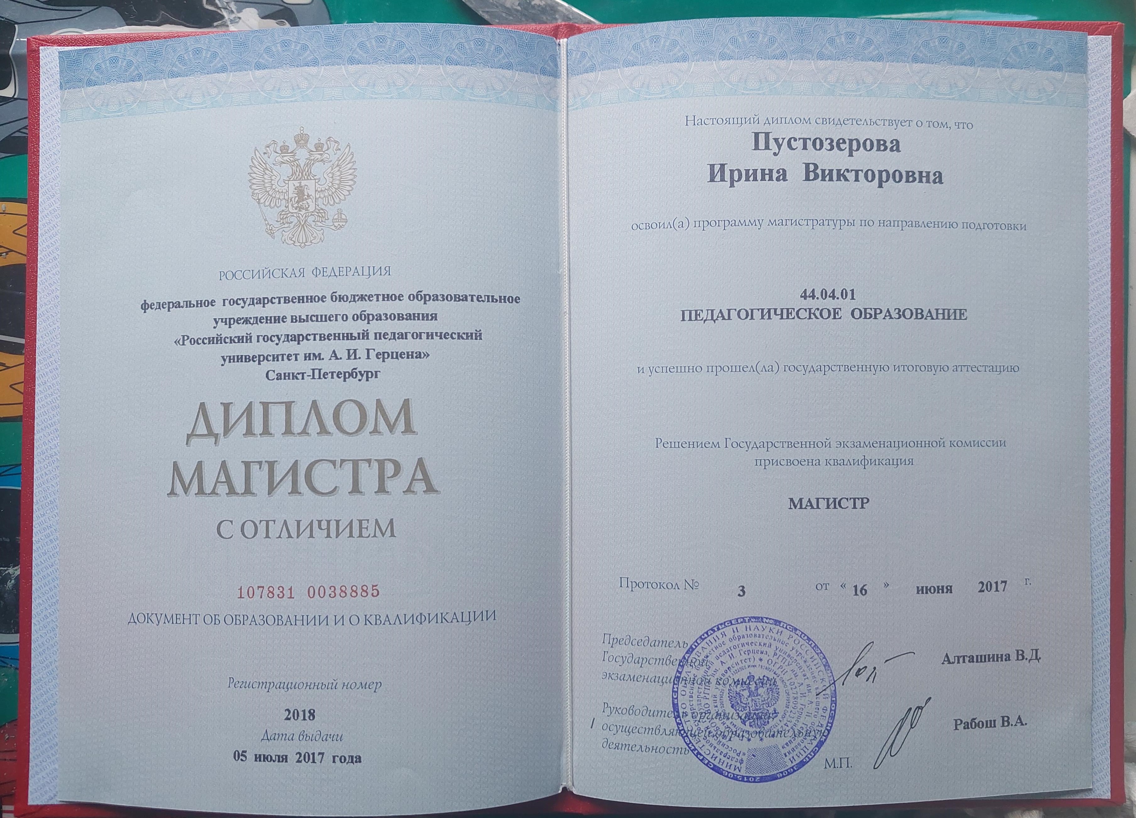 РГПУ имени А. И. Герцена, педагогическое образование, диплом магистра с отличием, 2017 год.