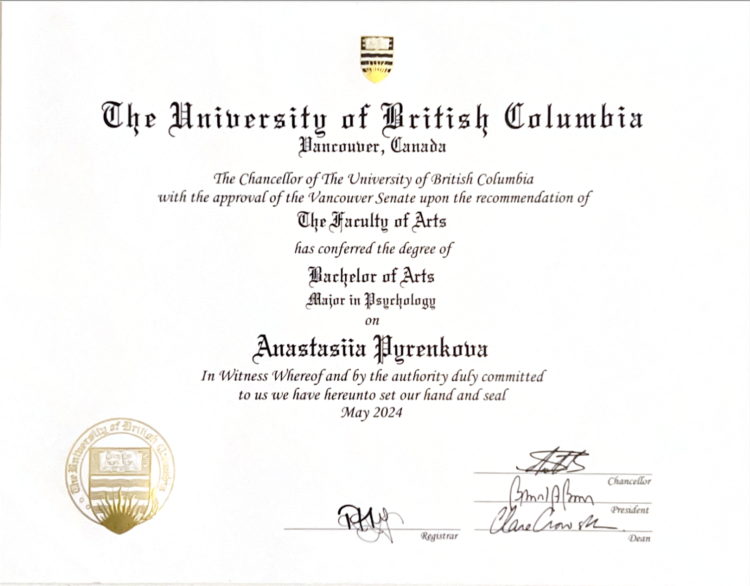 - Образование: Выпускница Университета Британской Колумбии (Канада), специальность "Психология", бакалавр.