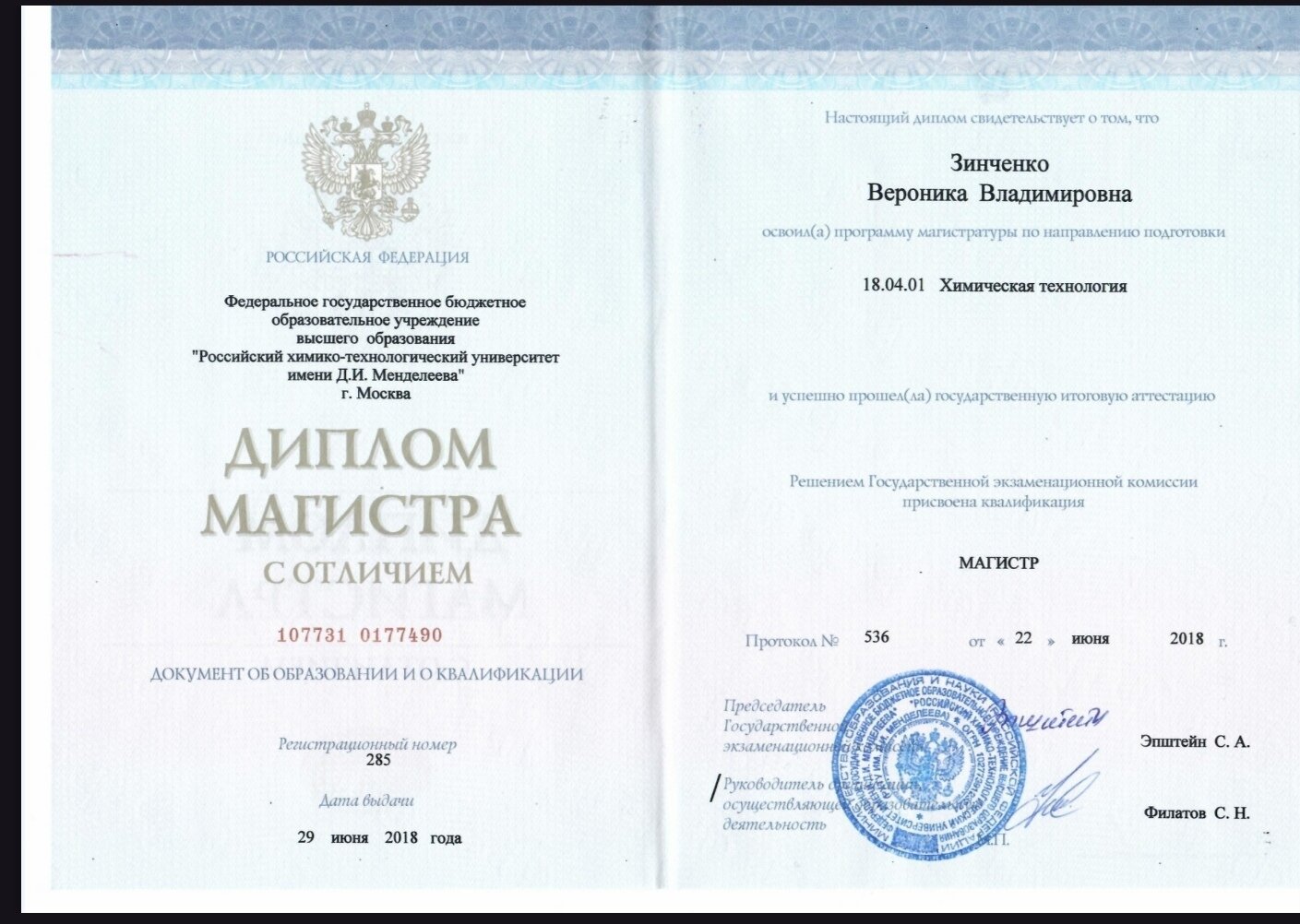 Образование: Высшее образование, РХТУ имени Д. И. Менделеева, специальность химическая технология (бакалавр 2016 год, магистр ( диплом с отличием) 2018 год).