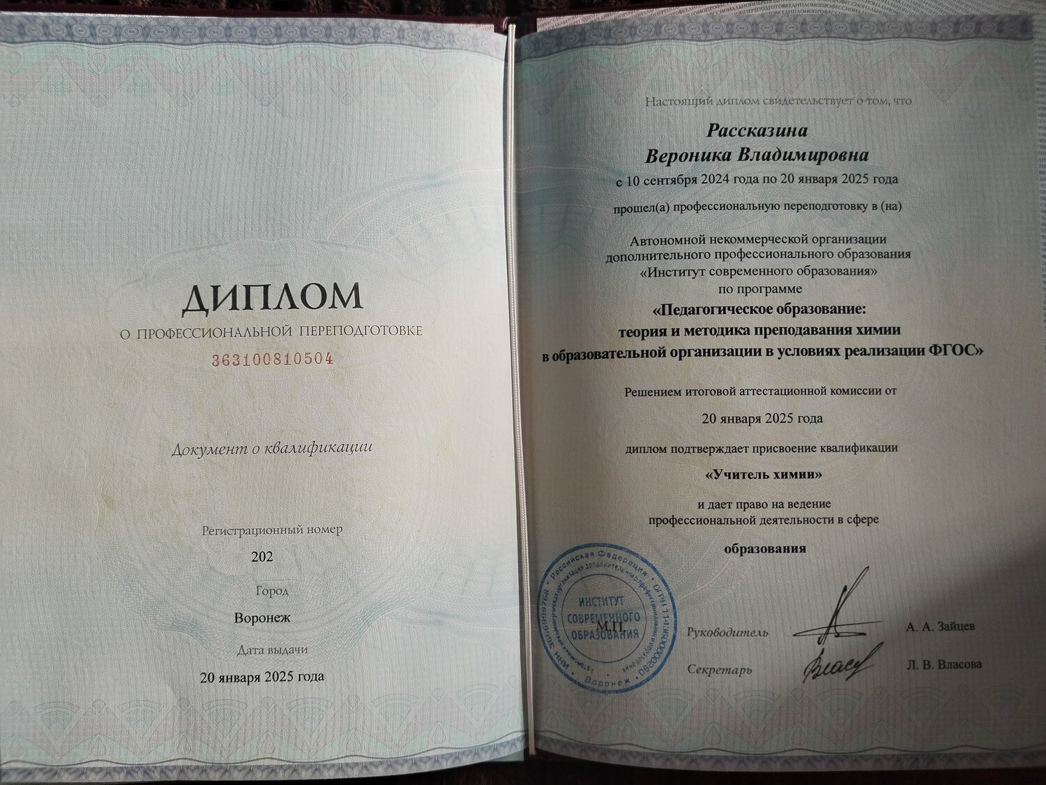 Диплом о профессиональной переподготовке, Институт Современного Образования, учитель химии, 2025 год.