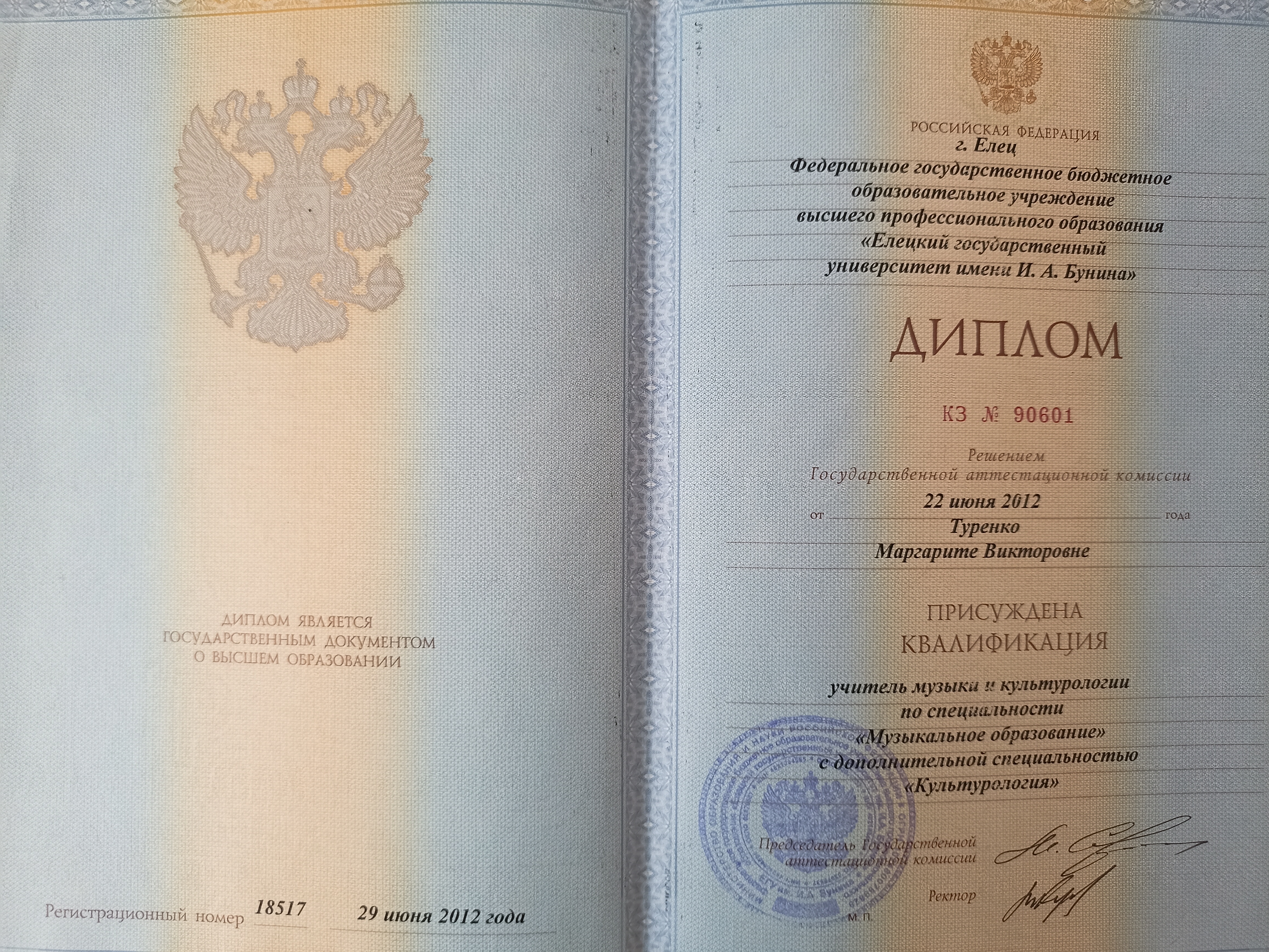 Образование: Высшее, Елецкий Государственный Университет имени И. А. Бунина, "Учитель музыки и культурологии", специалист, 2012 год.