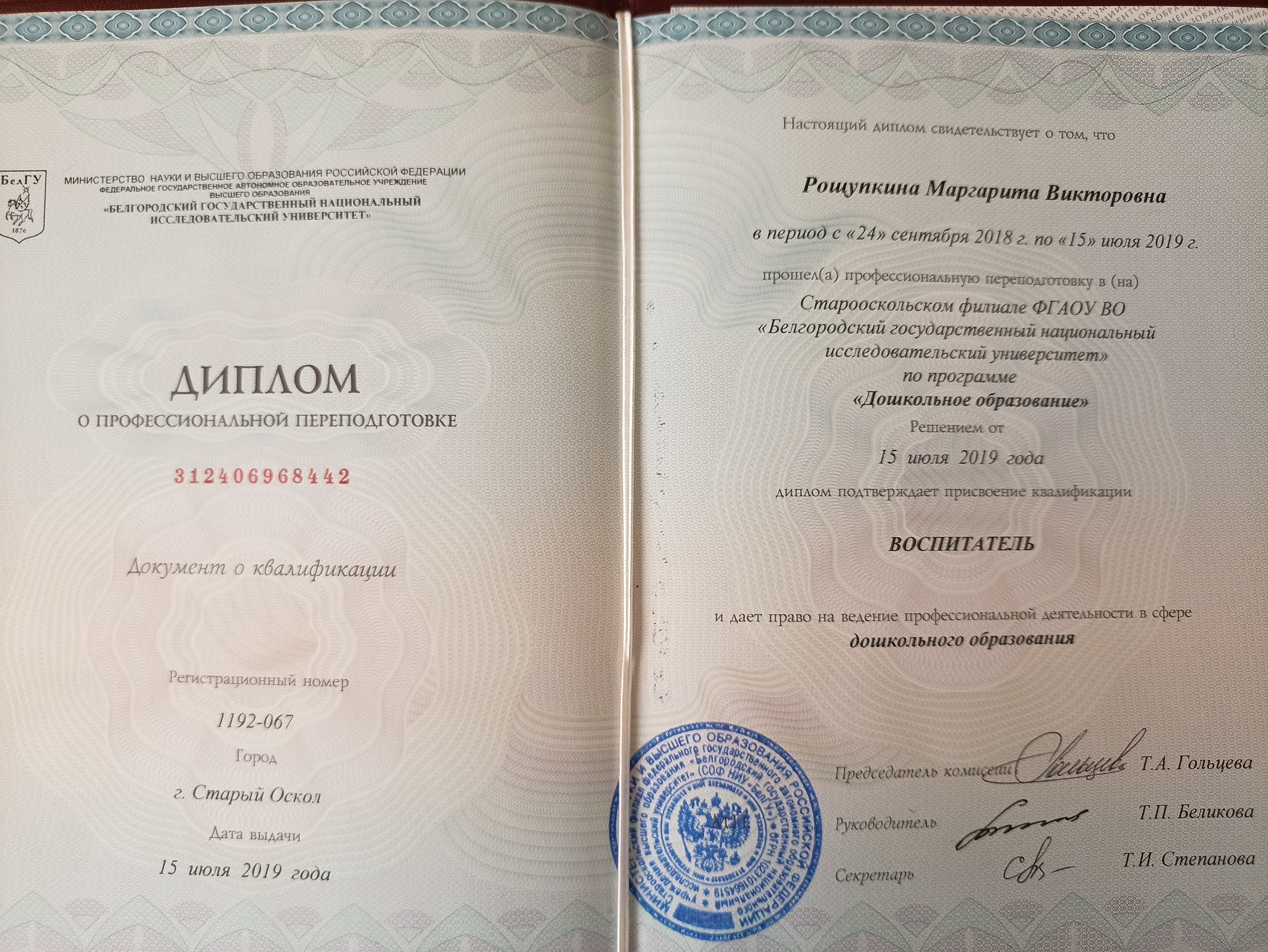 Диплом о профессиональной переподготовке, дошкольное образование, "Воспитатель", 2019 год.