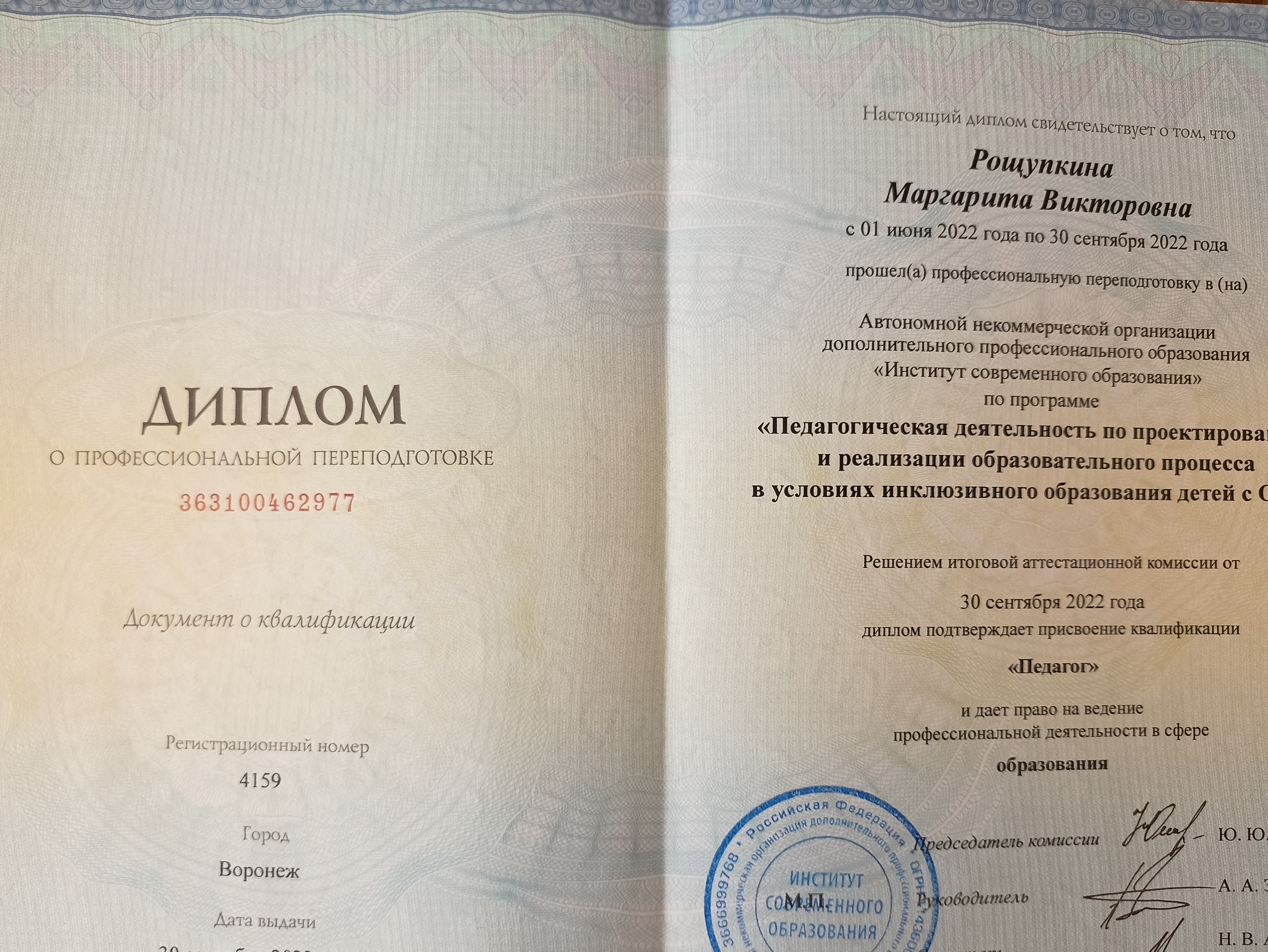 Диплом о профессиональной переподготовке, "Педагог", 2022 год.
