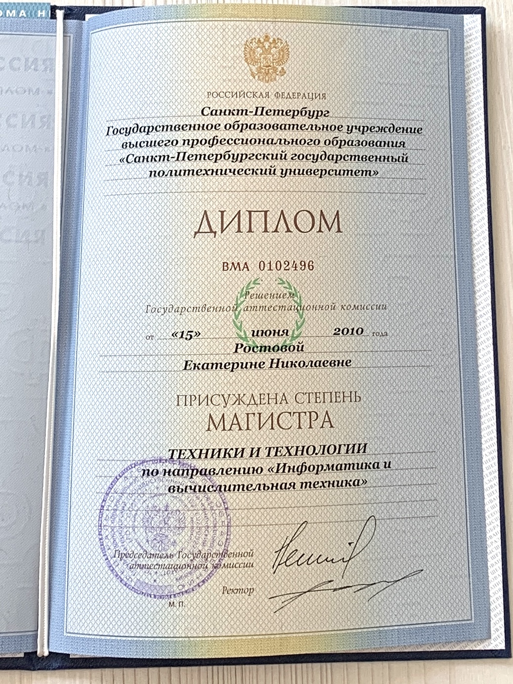 Образование: Санкт-Петербургский Государственный Политехнический Университет Петра Великого, факультет управления и информационных технологий, диплом магистра.