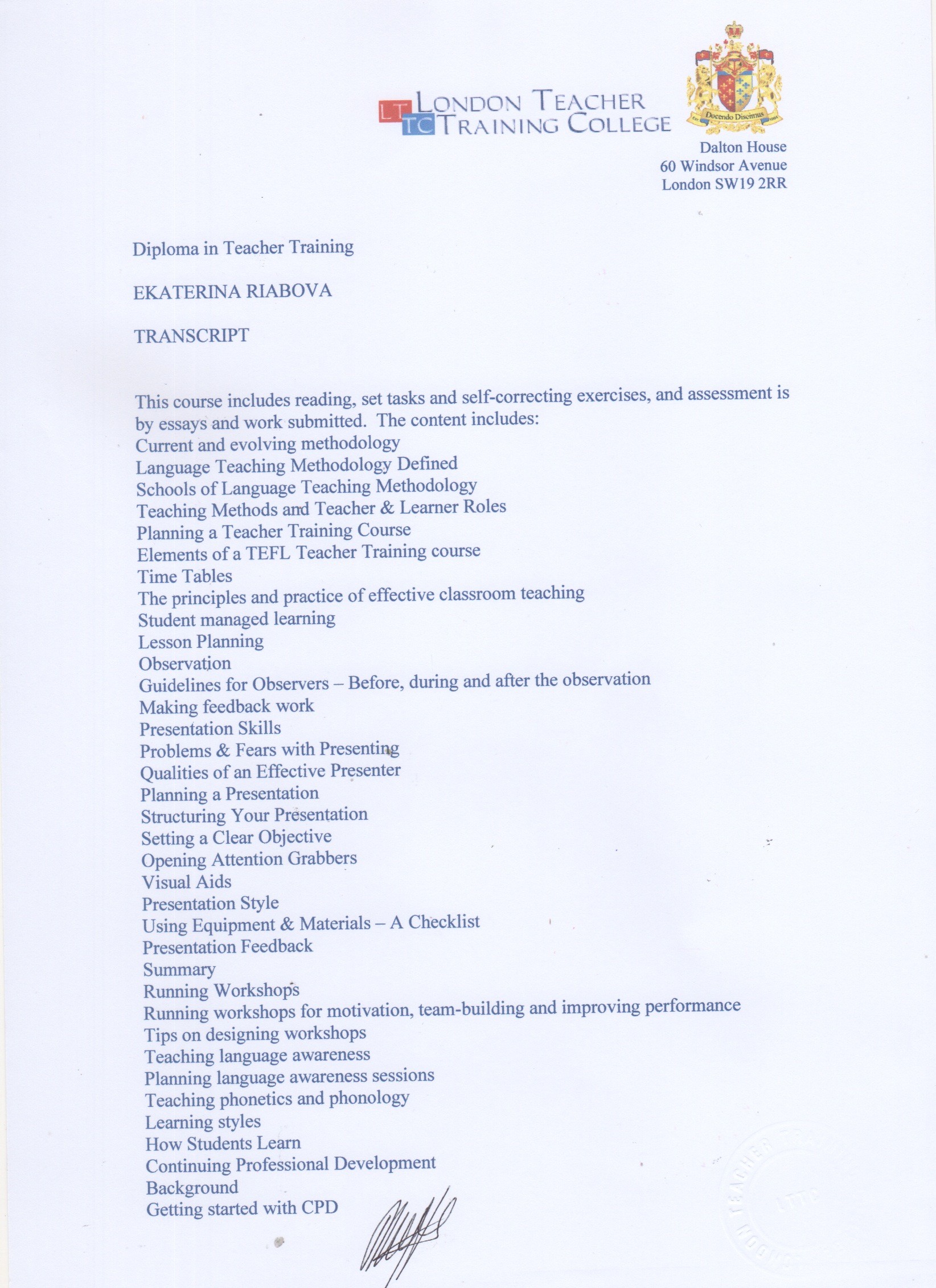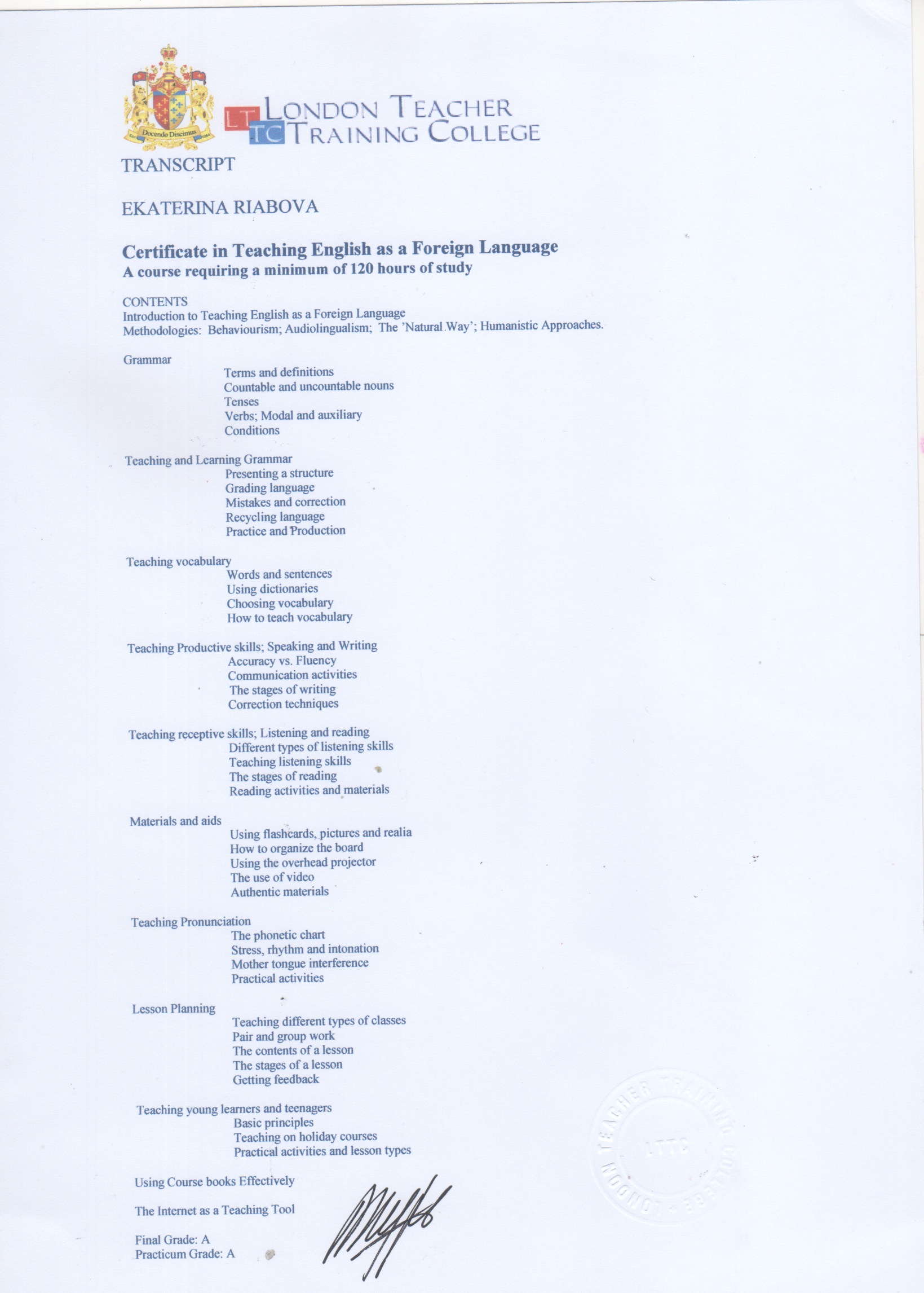 Дополнительная информация: Обучалась в London Teacher Training College. Прошла стажировки в Индии и Чили. Имею сертификат для проведения тренингов для преподавателей английского языка.