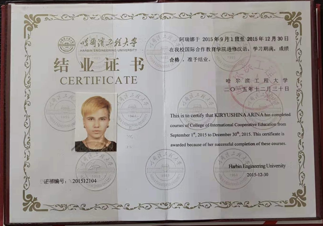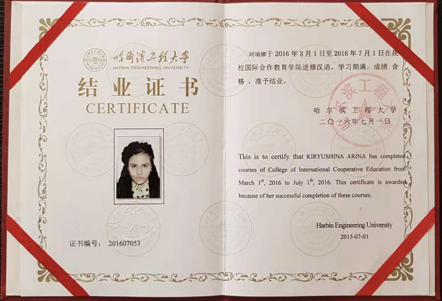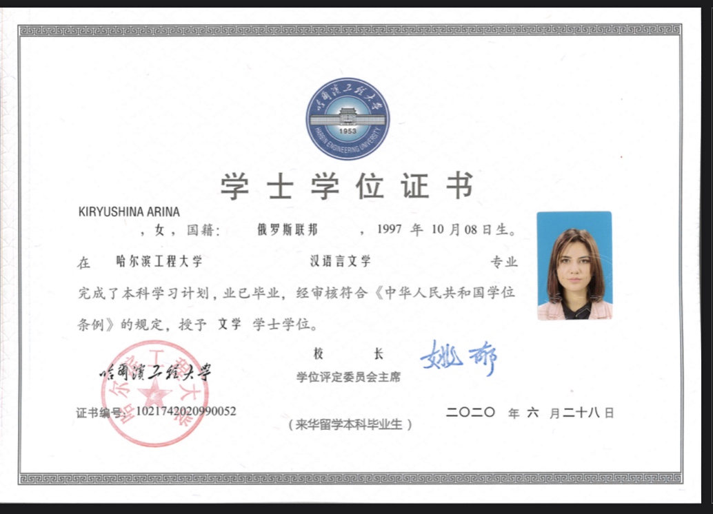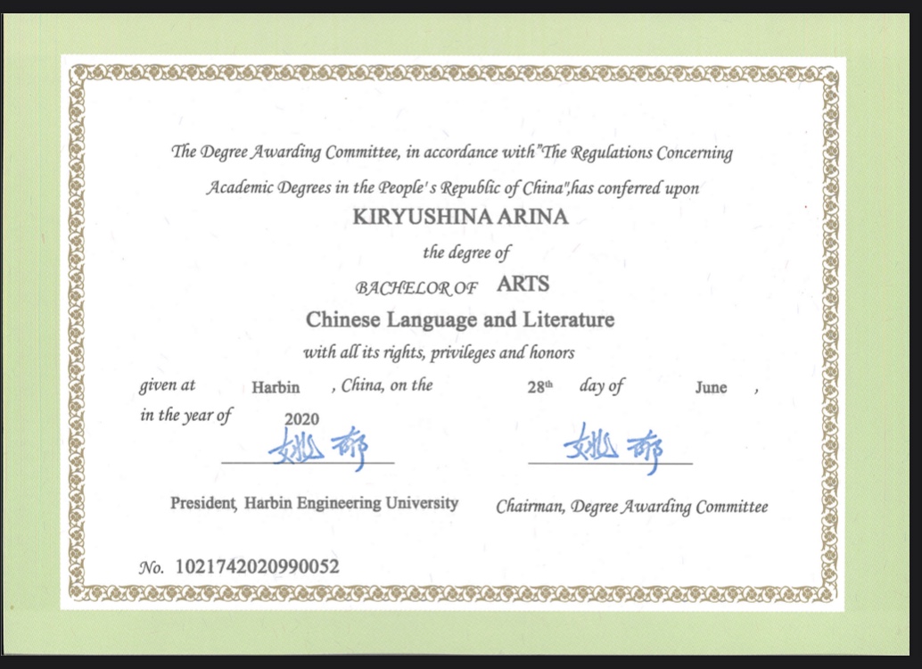 - Образование: Харбинский Инженерный Университет (КНР), «Китайский язык и литература», бакалавр, 2020 год. Учила китайский язык пять лет.