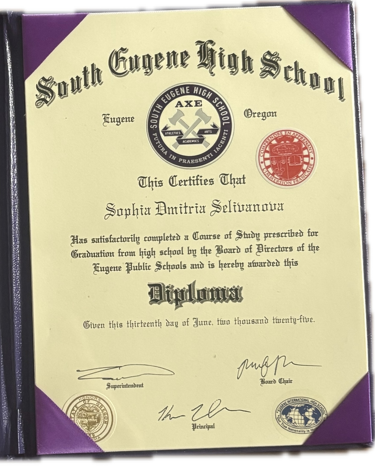 - Образование: University of Oregon (бюджет), педагогический факультет, лингвистика, 1 курс бакалавриата .