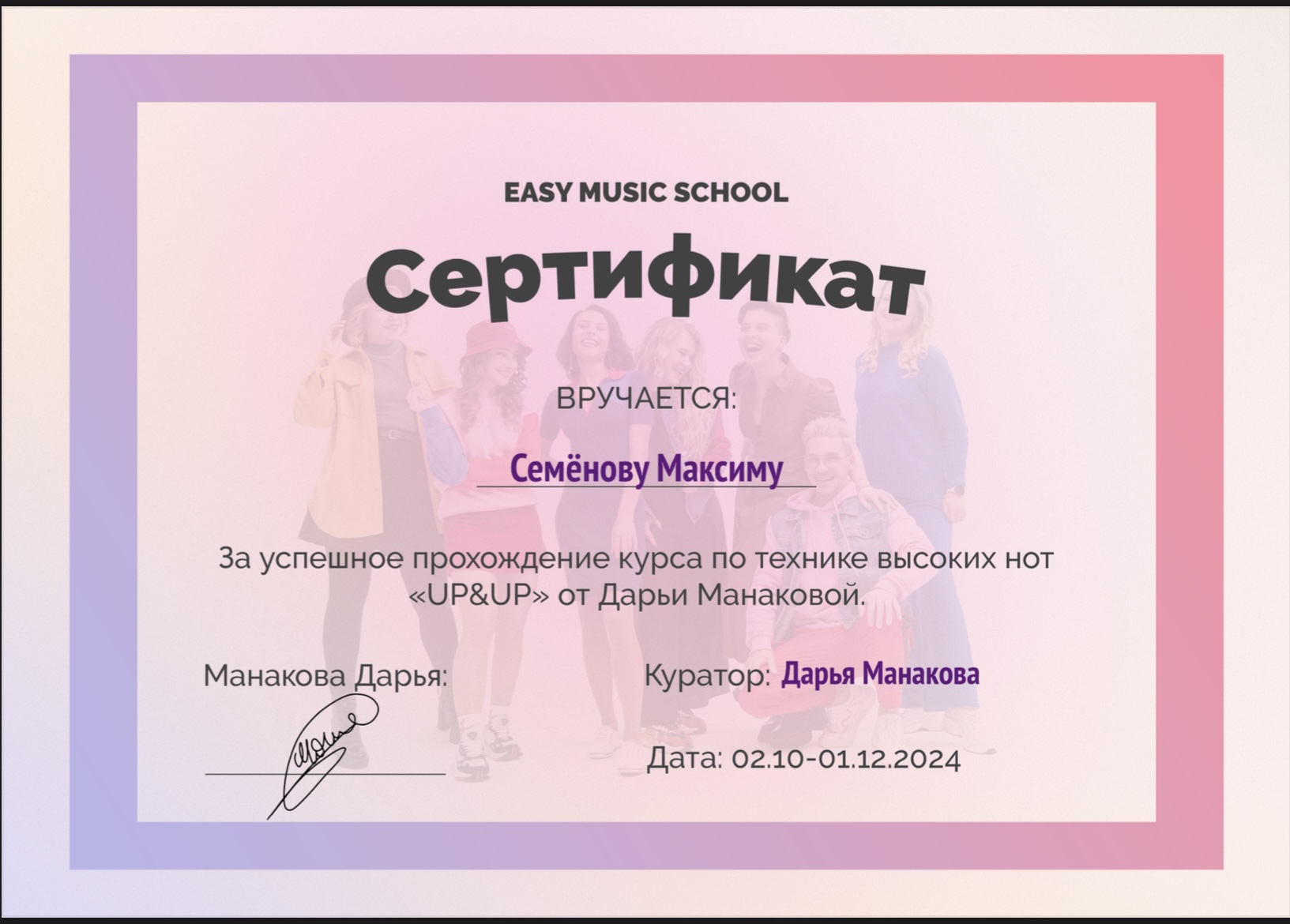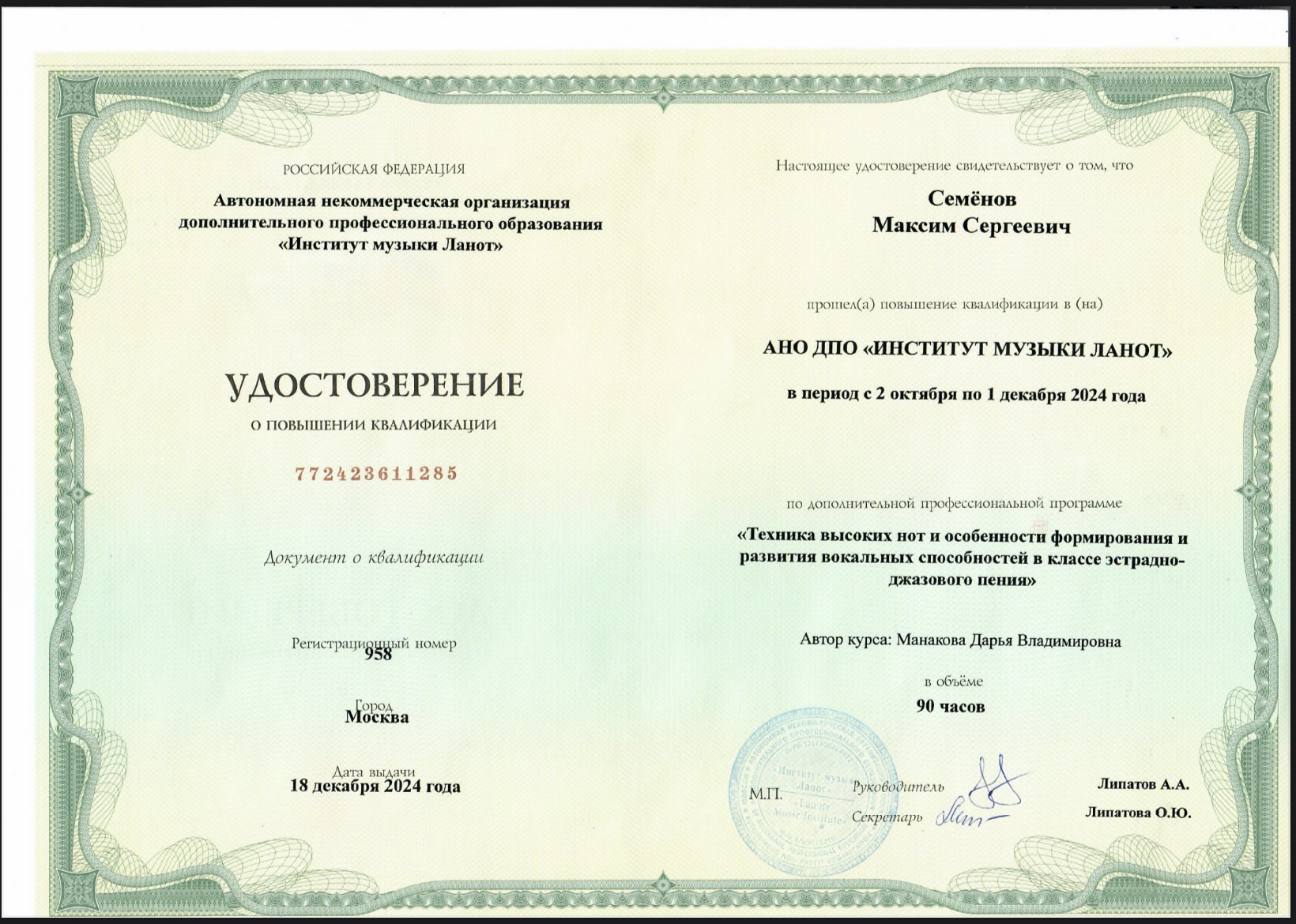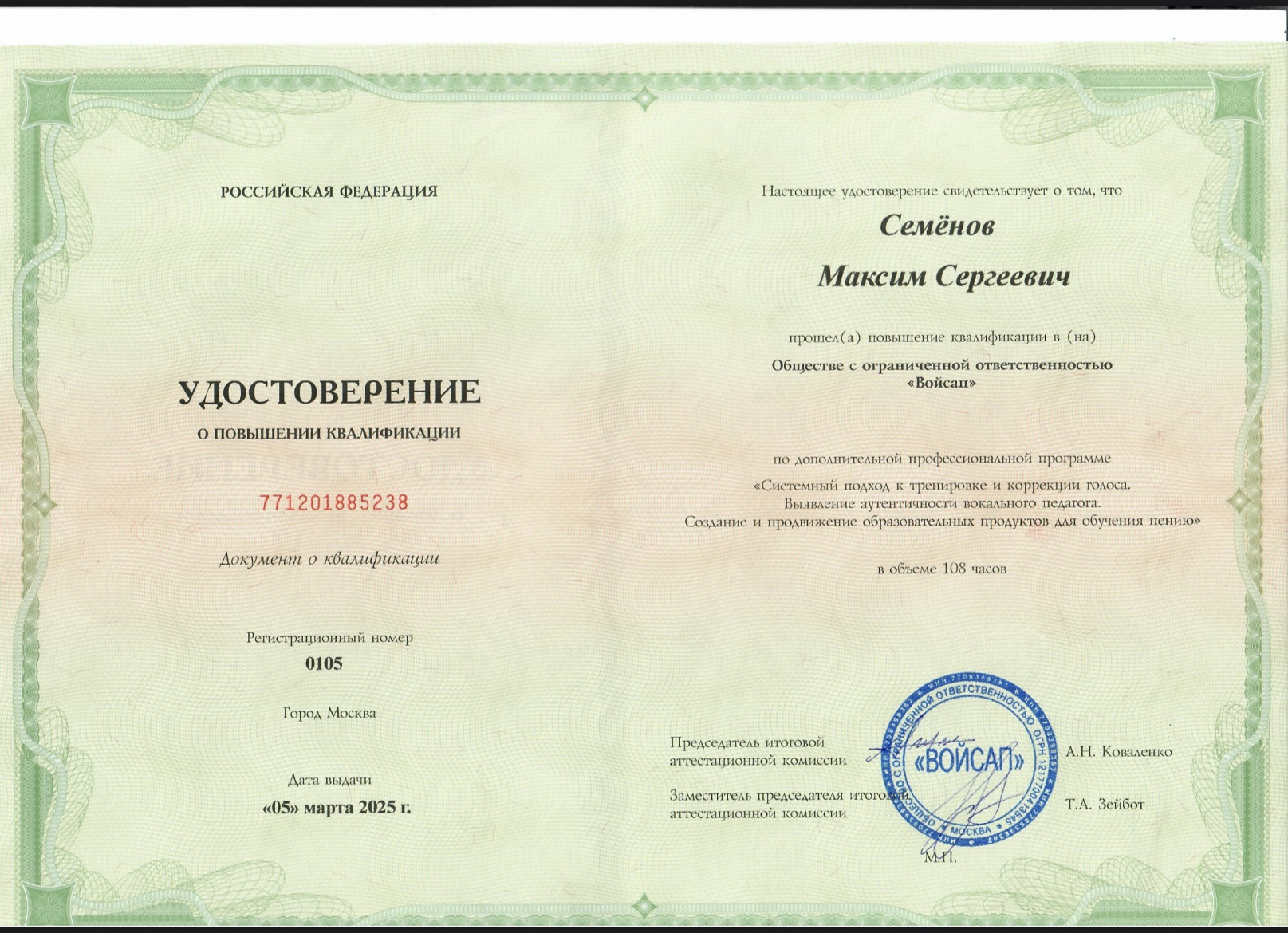Курс повышения квалификации Дарьи Манаковой «Up&Up», 2024 год. Курс повышения квалификации Антона Коваленко «Системный подход в тренировке голоса», 2025 год.