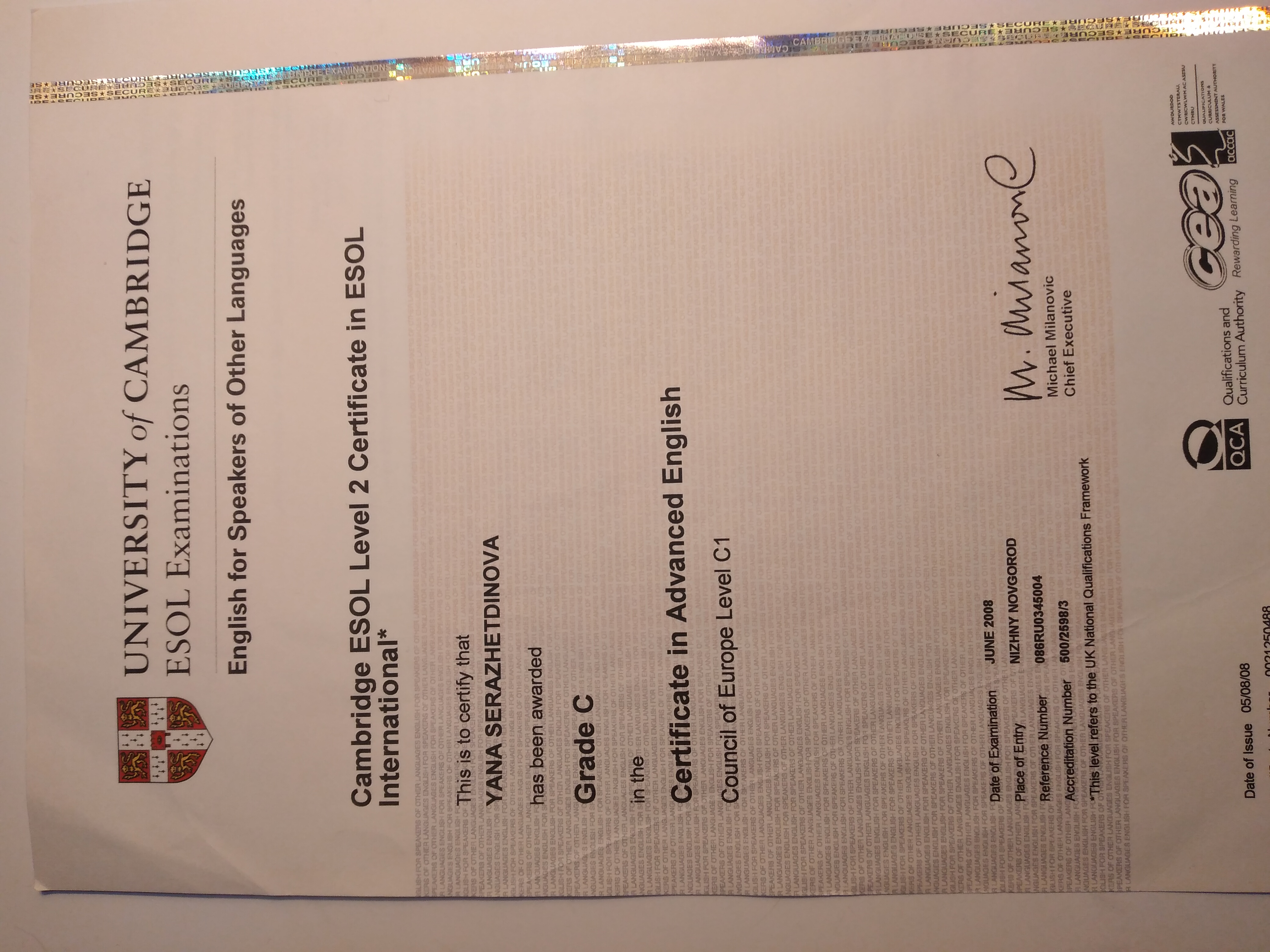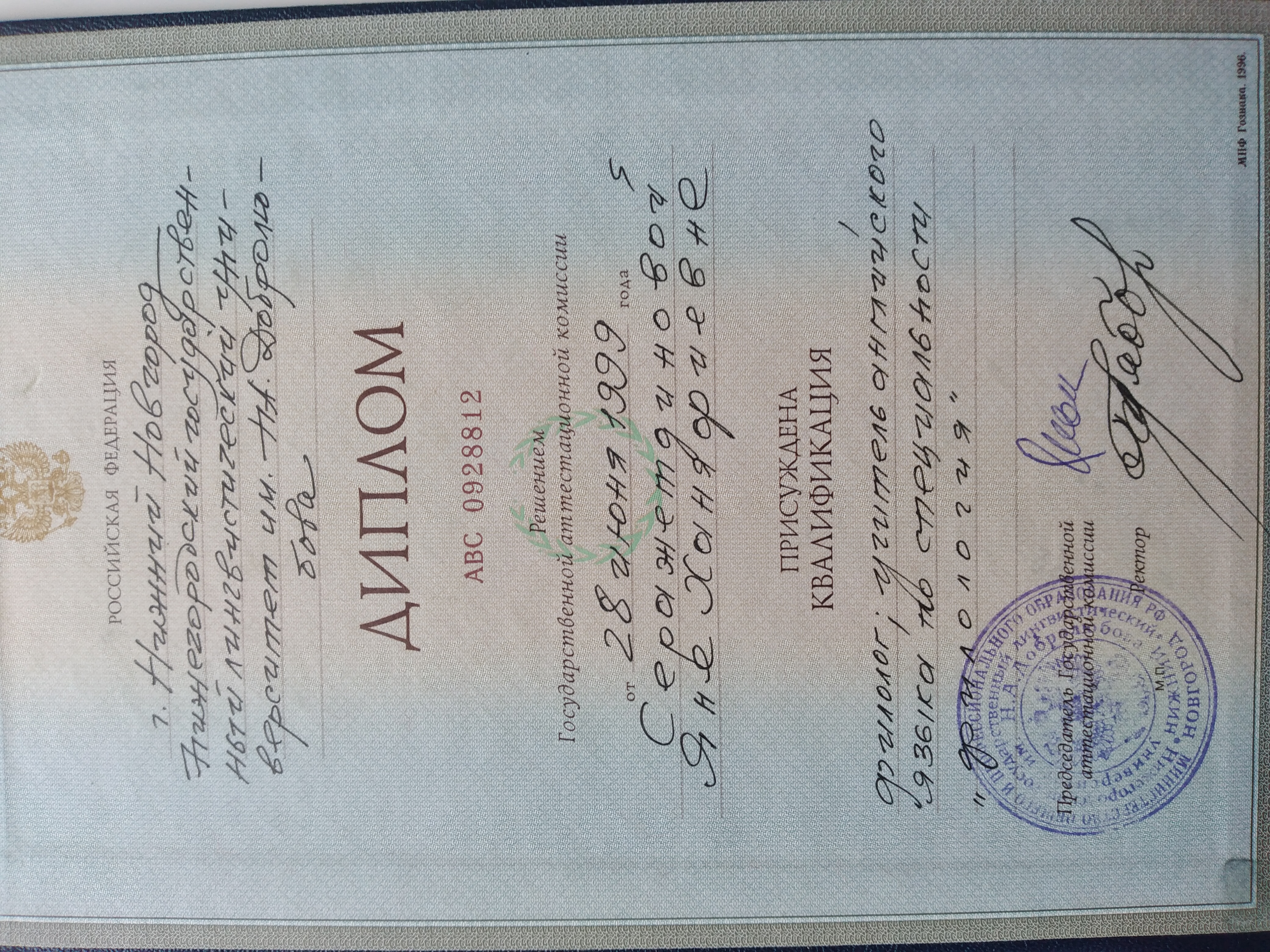 Нижегородский Государственный Лингвистический Университет имени Н. А. Добролюбова, филолог, учитель английского языка, 1999 год.