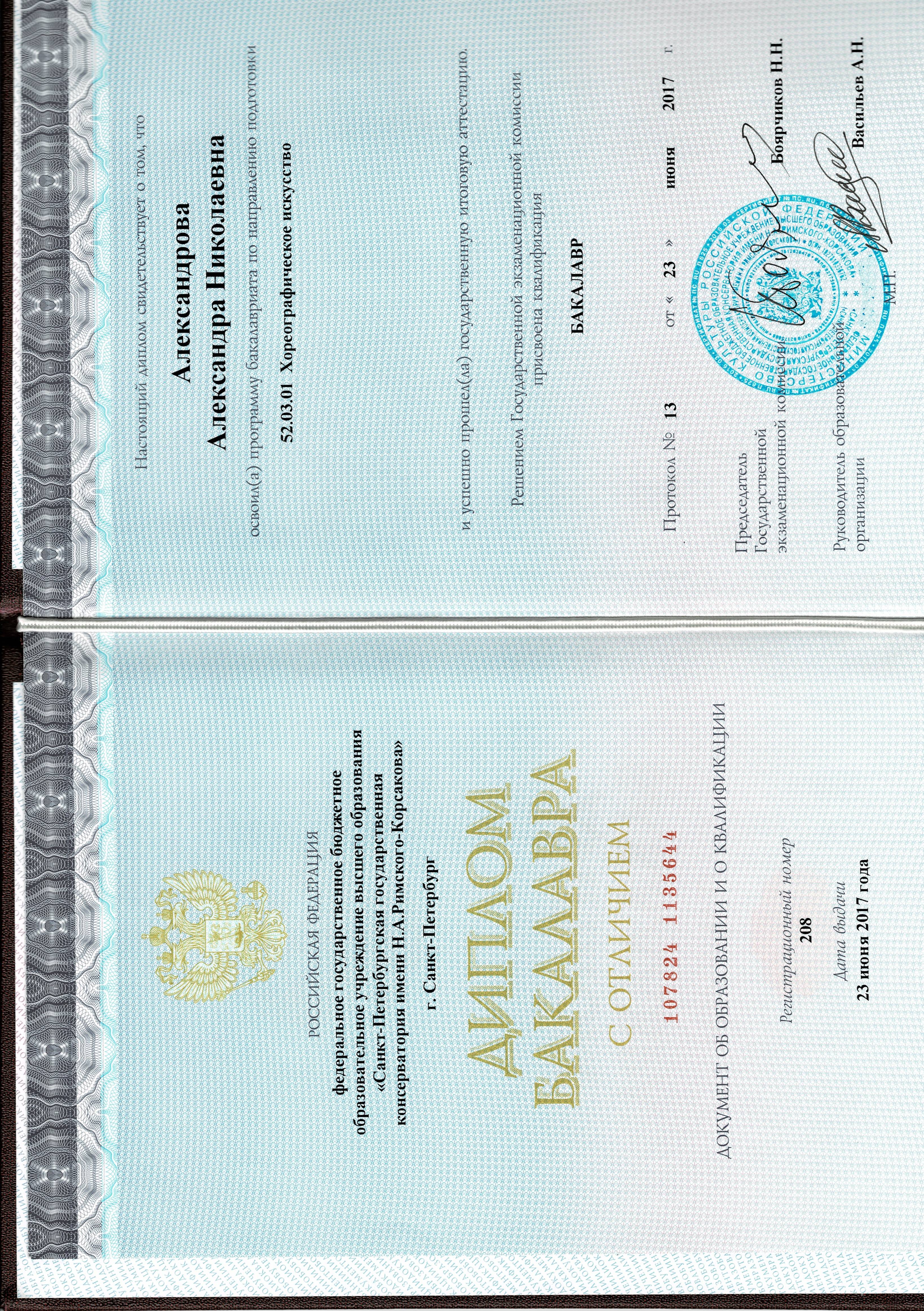- Образование: Высшее, Санкт-Петербургская Государственная Консерватория имени Н. А. Римского-Корсакова, хореографическое искусство, диплом с отличием, бакалавр, 2017 год.