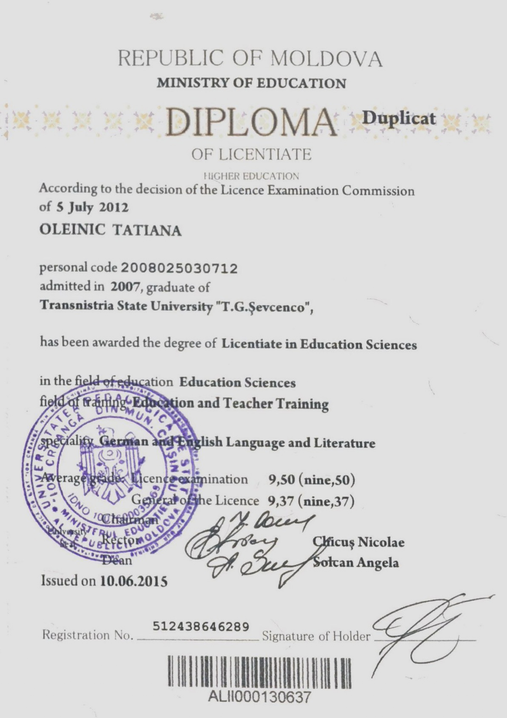 - Образование: Приднестровский Государственный Университет имени Т. Г. Шевченко, специальность «Лингвист, преподаватель немецкого и английского языка», специалист, 2012 год.