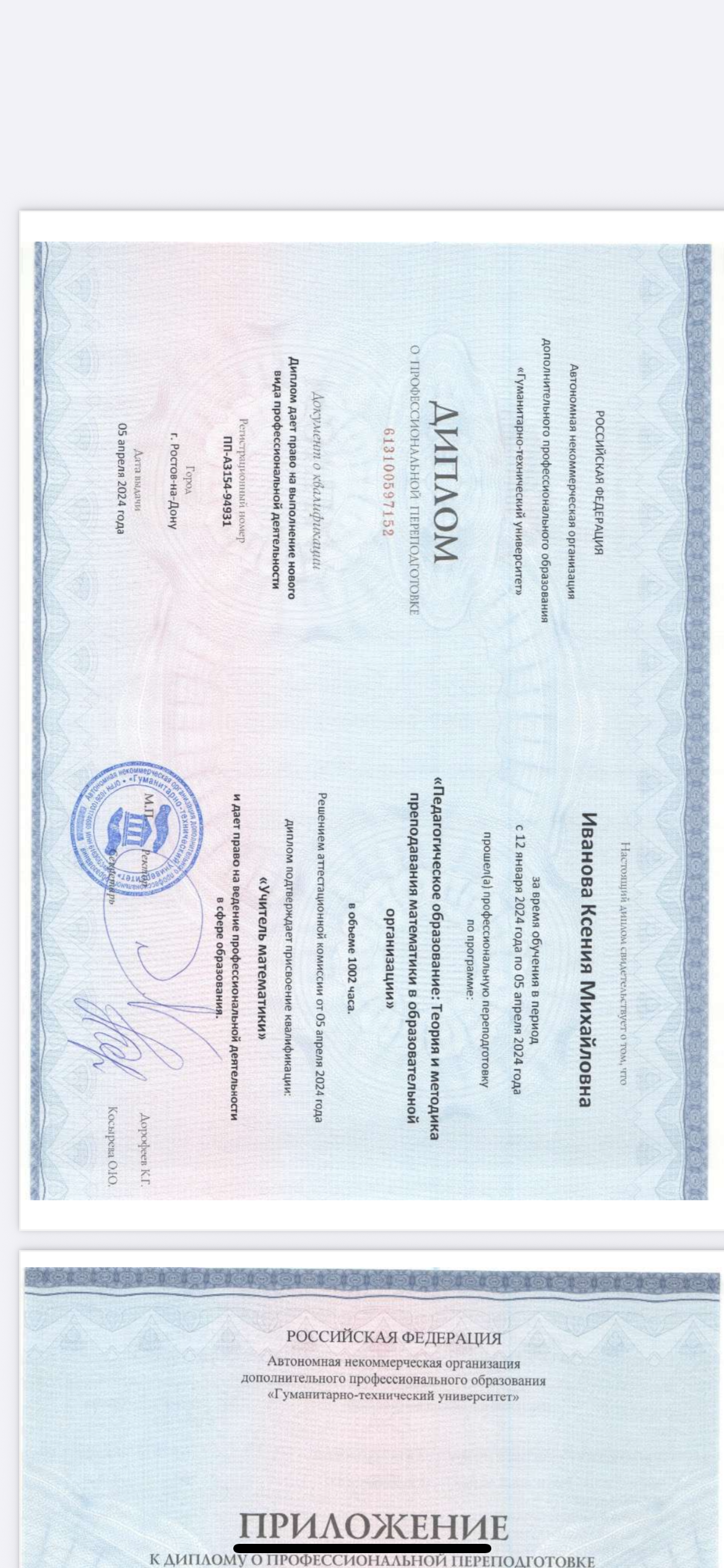 Диплом о профессиональной переподготовке, "Учитель математики", 2024 год.