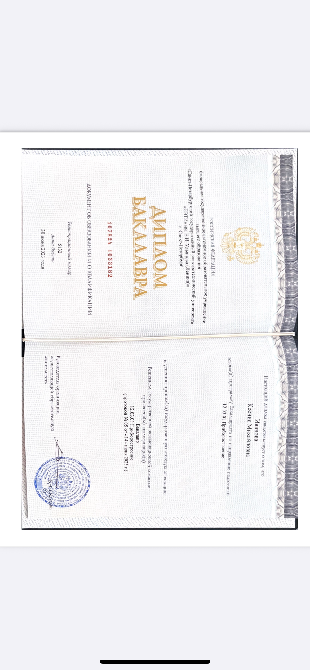Образование: Санкт-Петербургский Государственный Электротехнический Университет «ЛЭТИ», "Приборостроение", бакалавр, 2023 год.