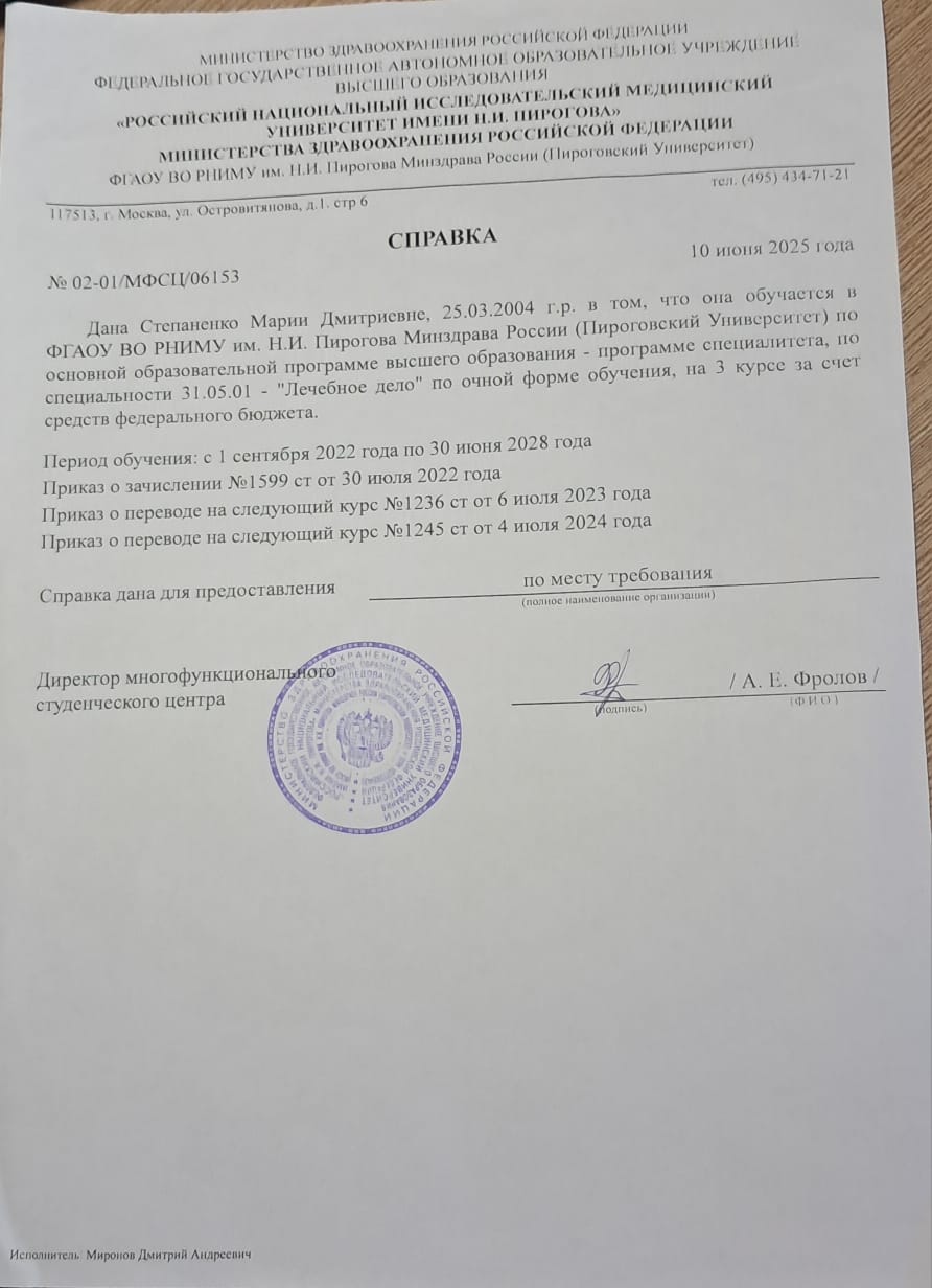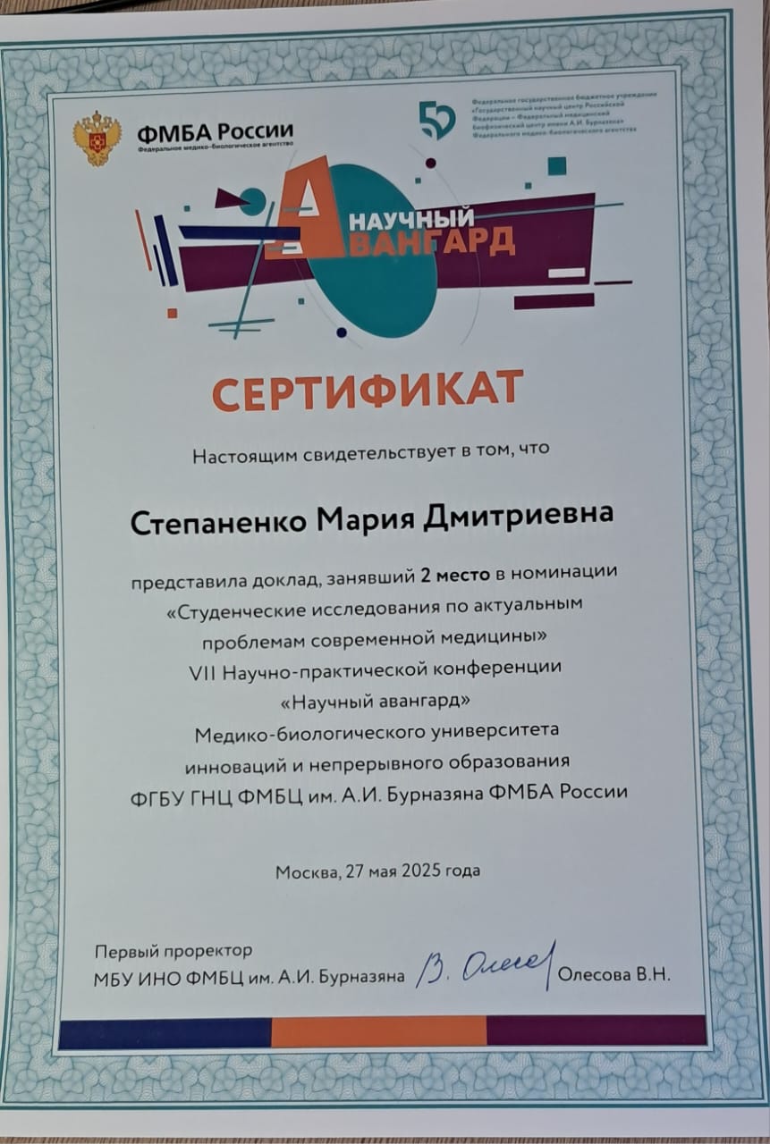 Образование: ФГАОУ ВО РНИМУ имени Н. И. Пирогова Минздрава России (Пироговский Университет), Медико-Биологический Университет, специальность "Лечебное дело" (фундаментальная медицина), 4 курс.