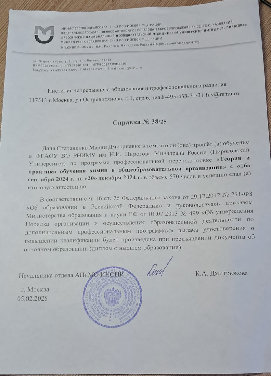 Профессиональная переподготовка "Теория и практика обучения химии в общеобразовательной организации (учитель химии)", 2024 год.