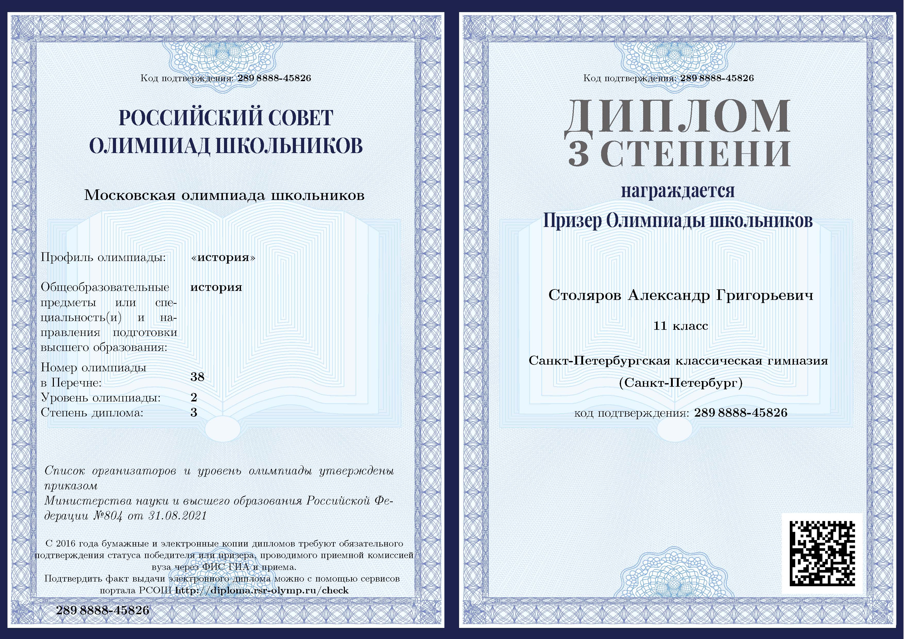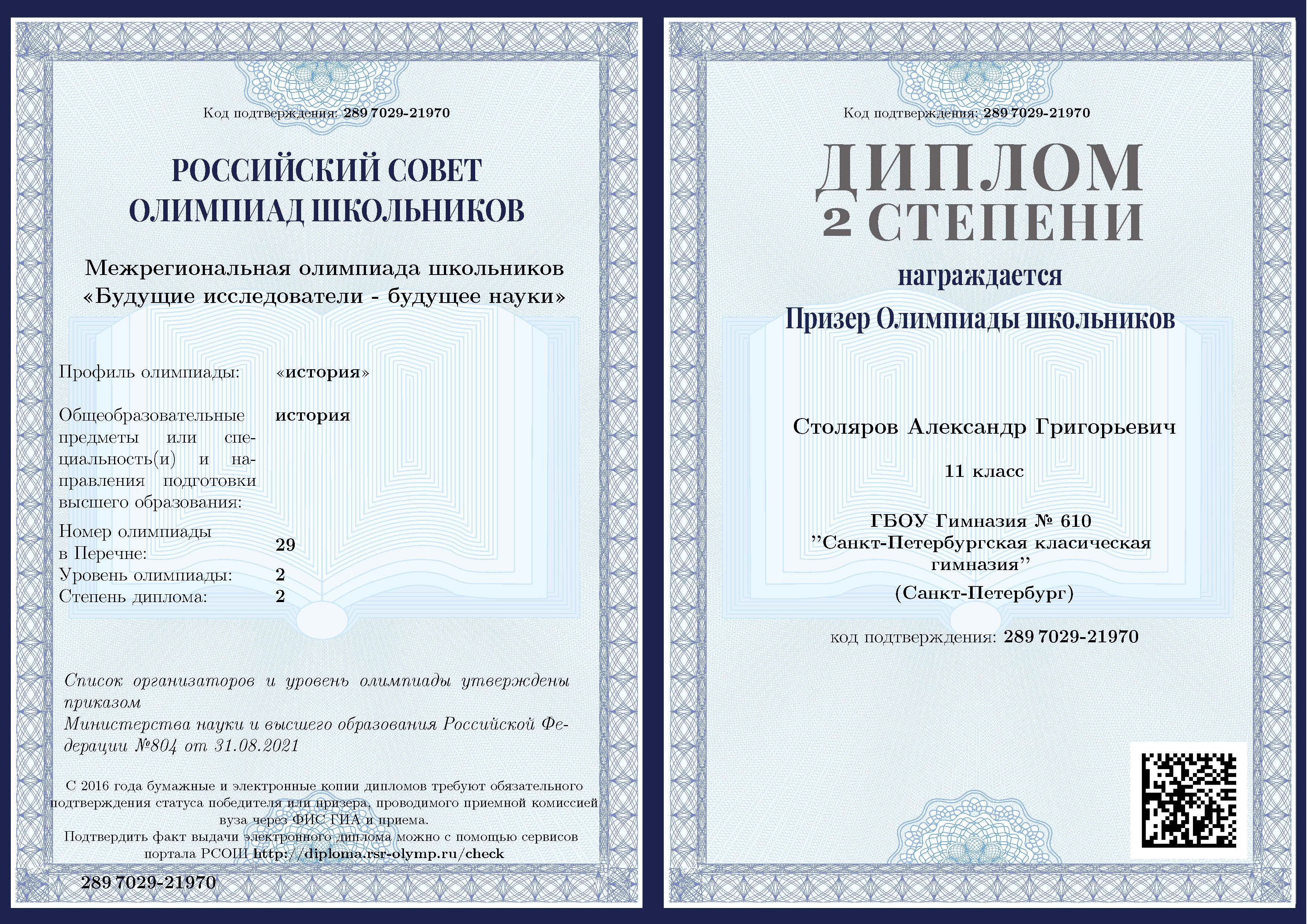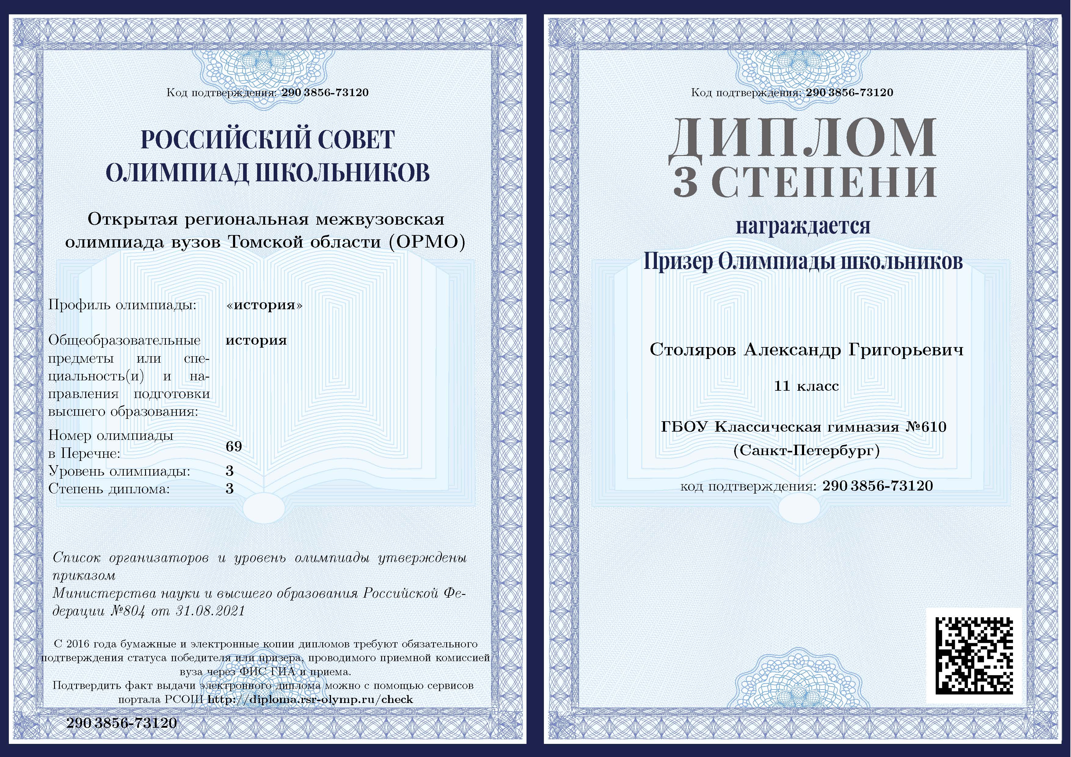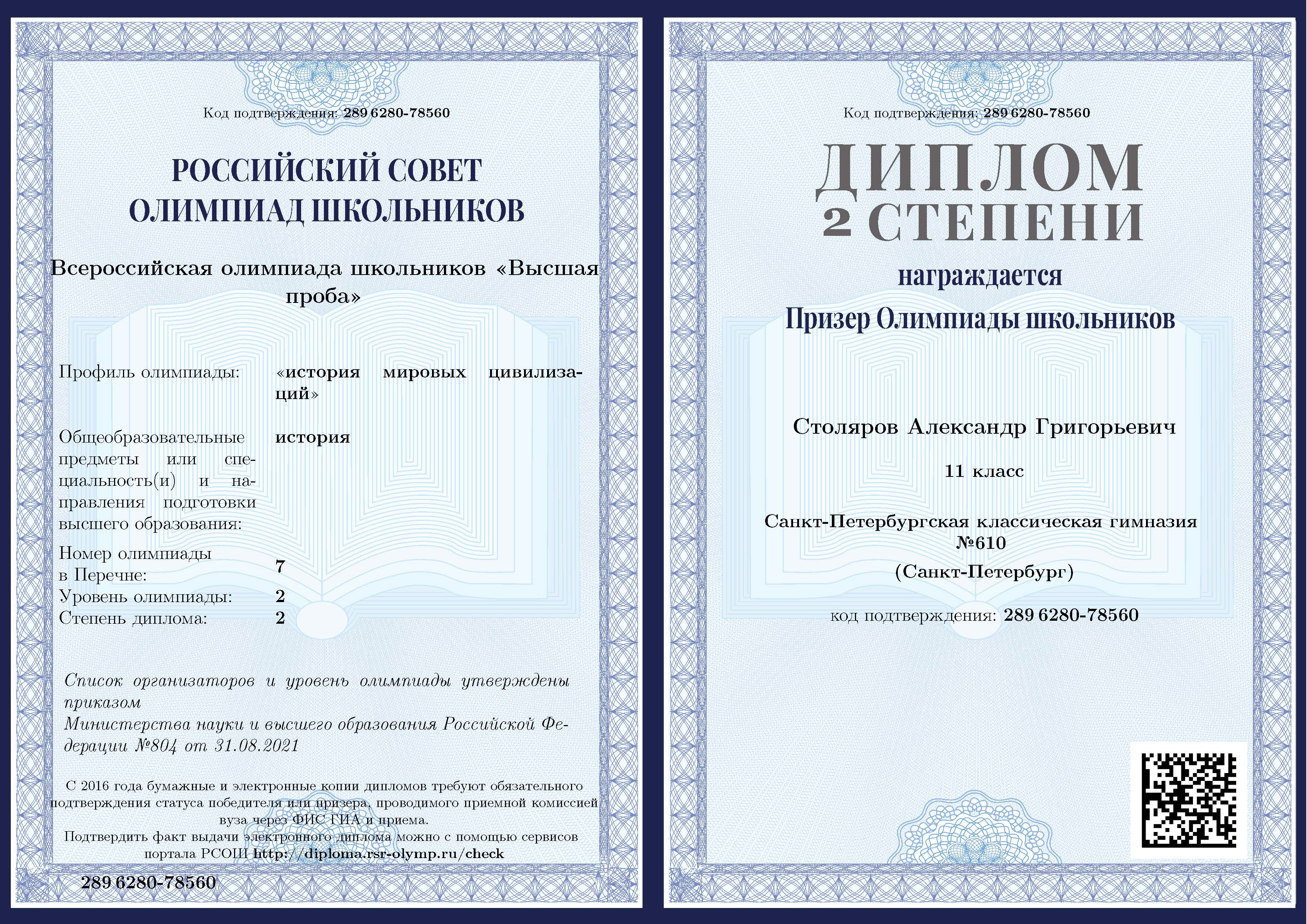 Результат ЕГЭ по истории 96 баллов. Я являюсь победителем и призёров множества перечневых олимпиад по истории, а все 4 предмета сдал на 90+ баллов. Победитель Толстовской олимпиады по истории, 2022 год. Призёр олимпиады "Высшая проба" по истории и истории мировых цивилизаций, МОШ по истории, Межрегиональных олимпиад "Будущие исследователи - будущее науки" и ОРМО по истории....