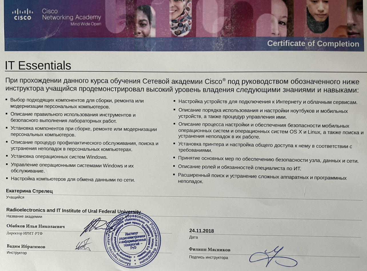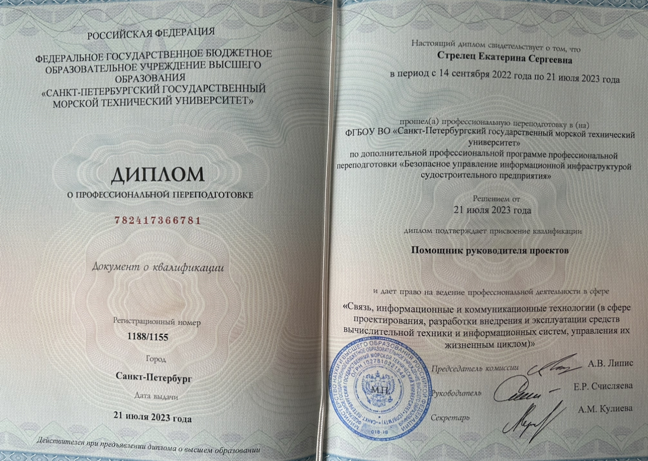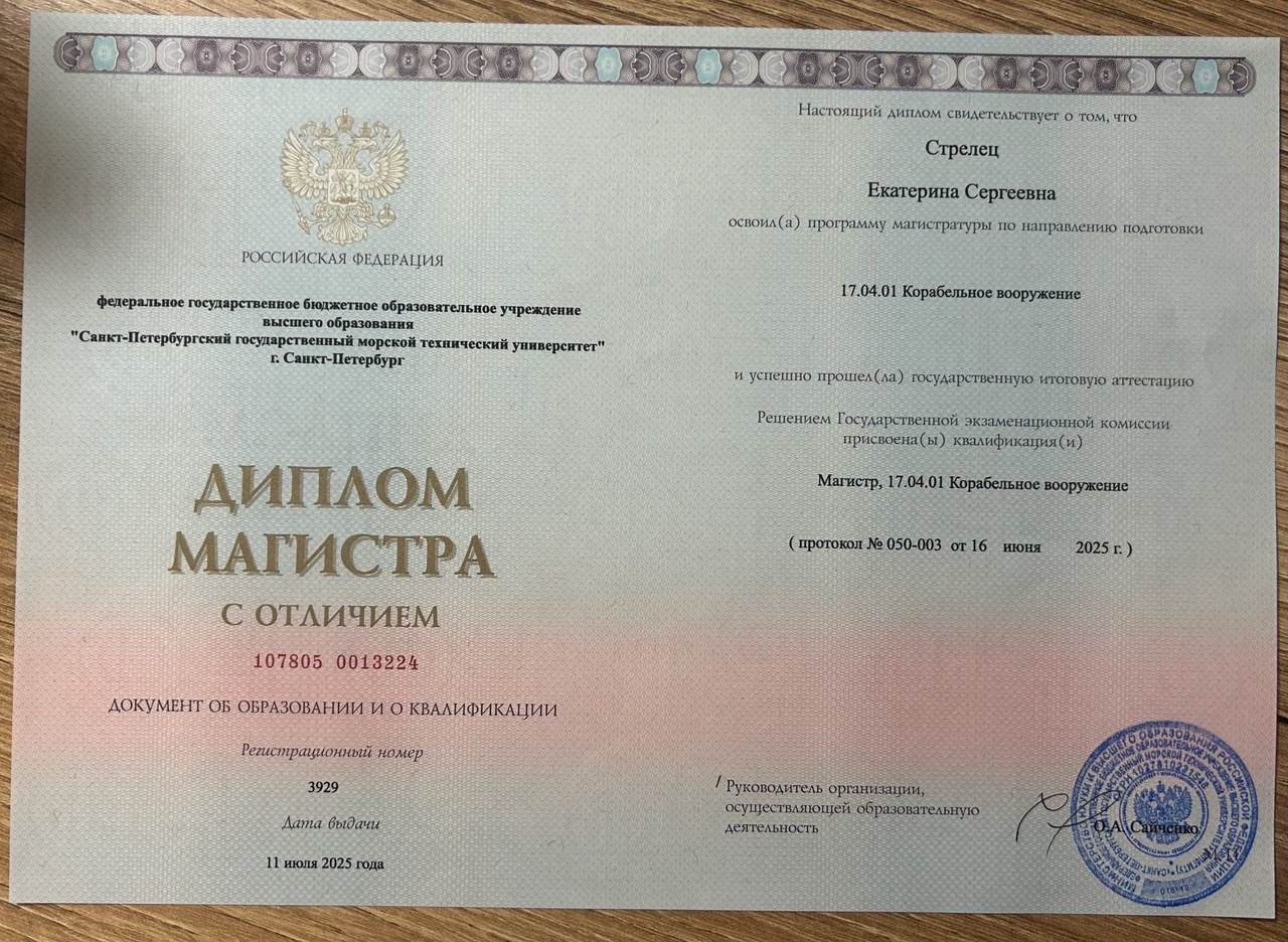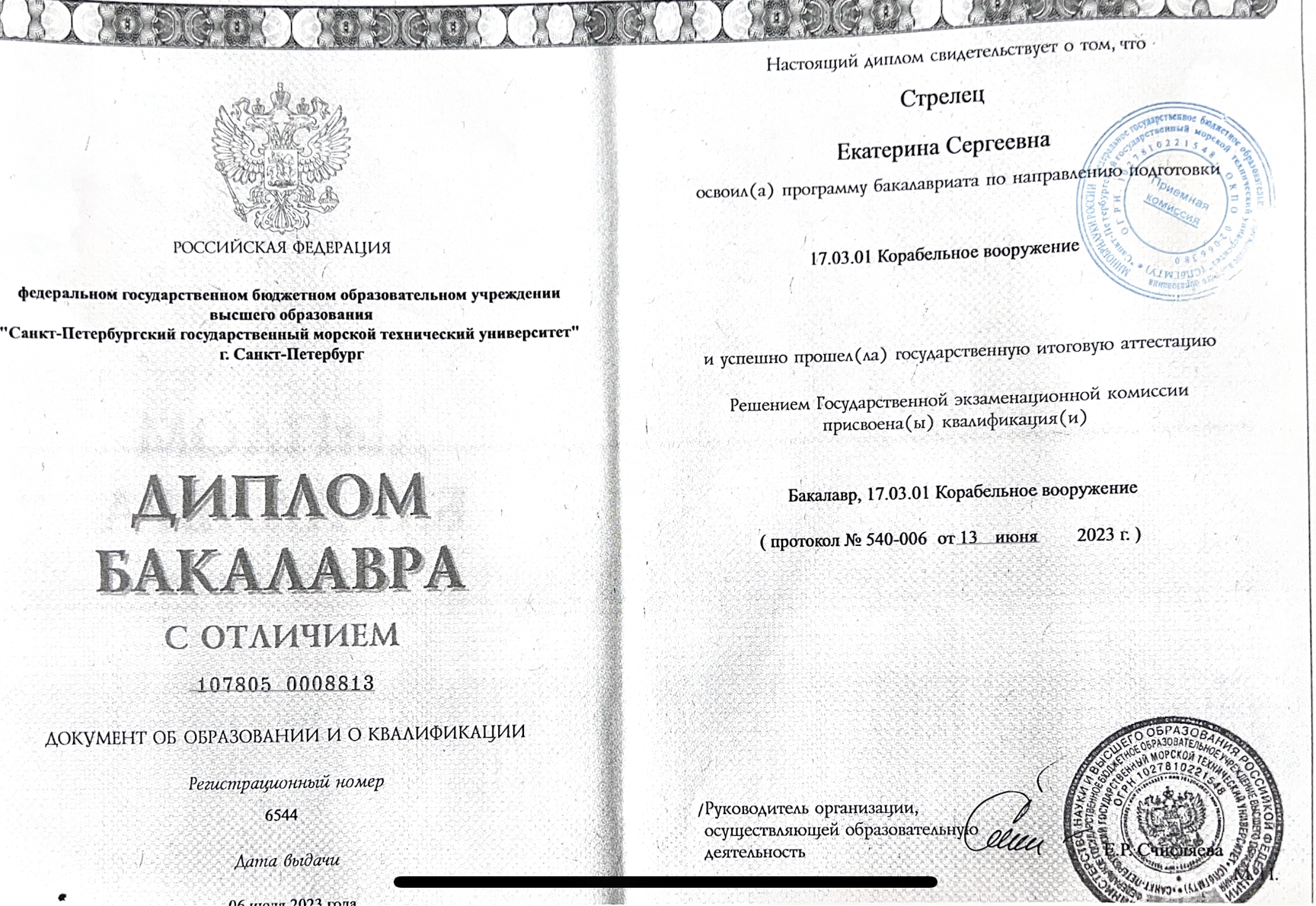 - Образование: Санкт-Петербургский Государственный Морской Технический Университет, корабельное вооружение, диплом с отличием (бакалавр, 2023 год, магистр 2025 год).
