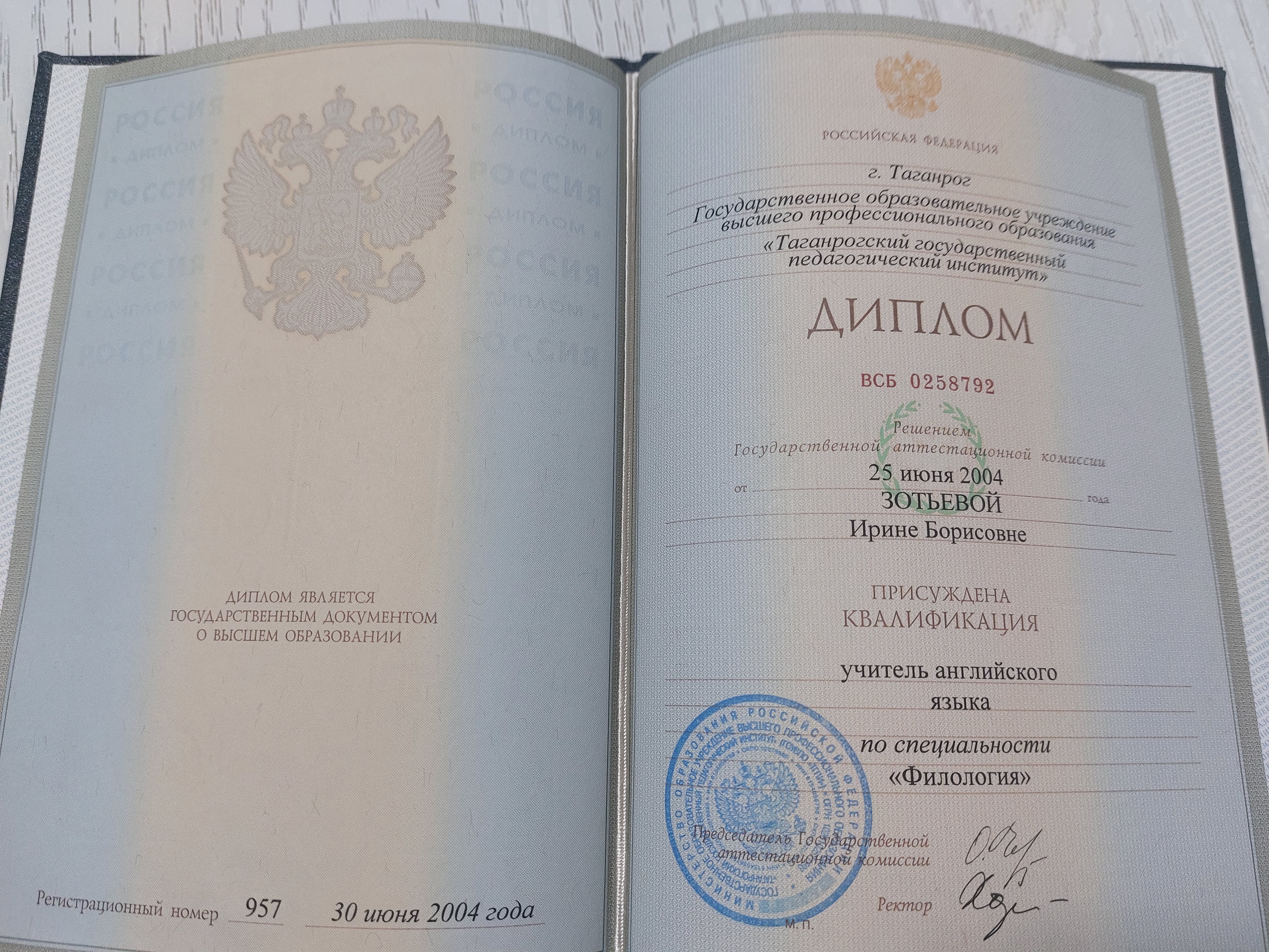 - Образование: Высшее, Таганрогский Государственный Педагогический Институт, "Филология", учитель английского языка, специалист, 2004 год.