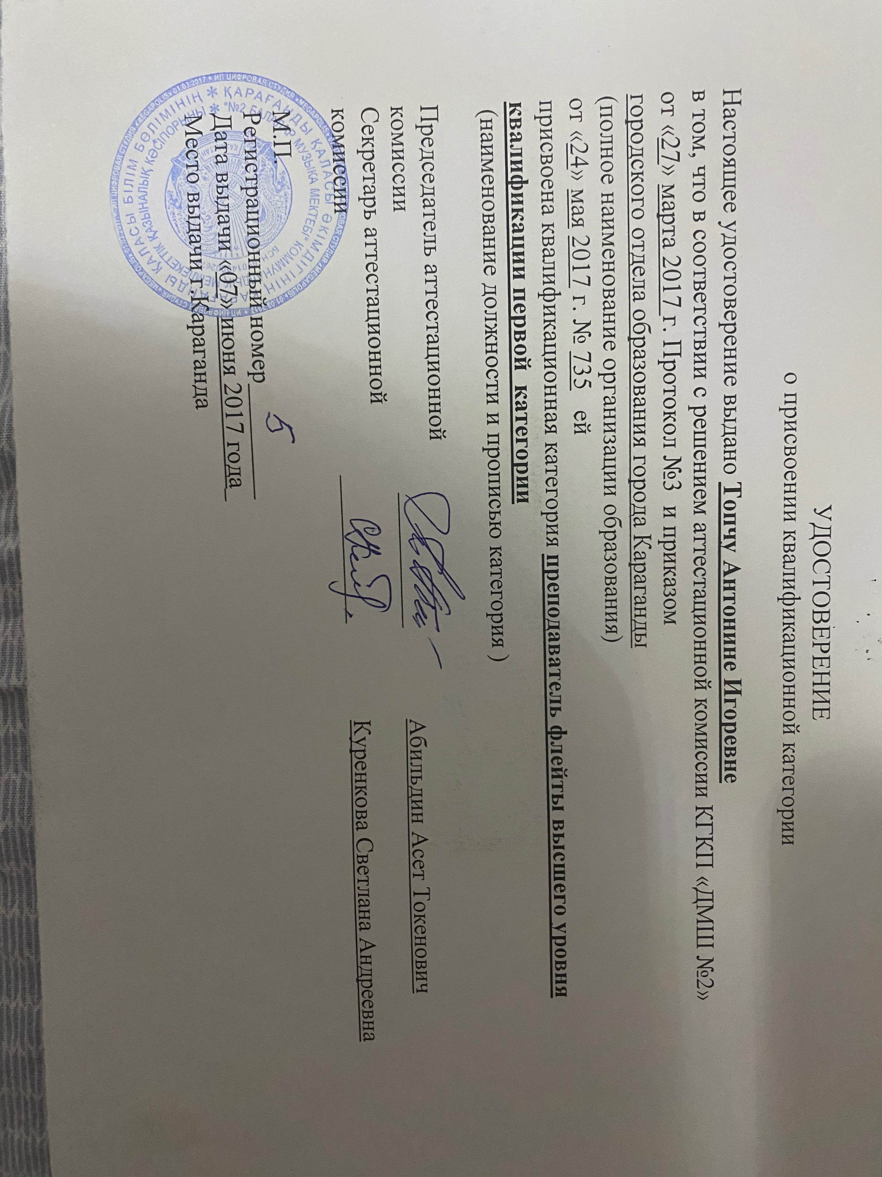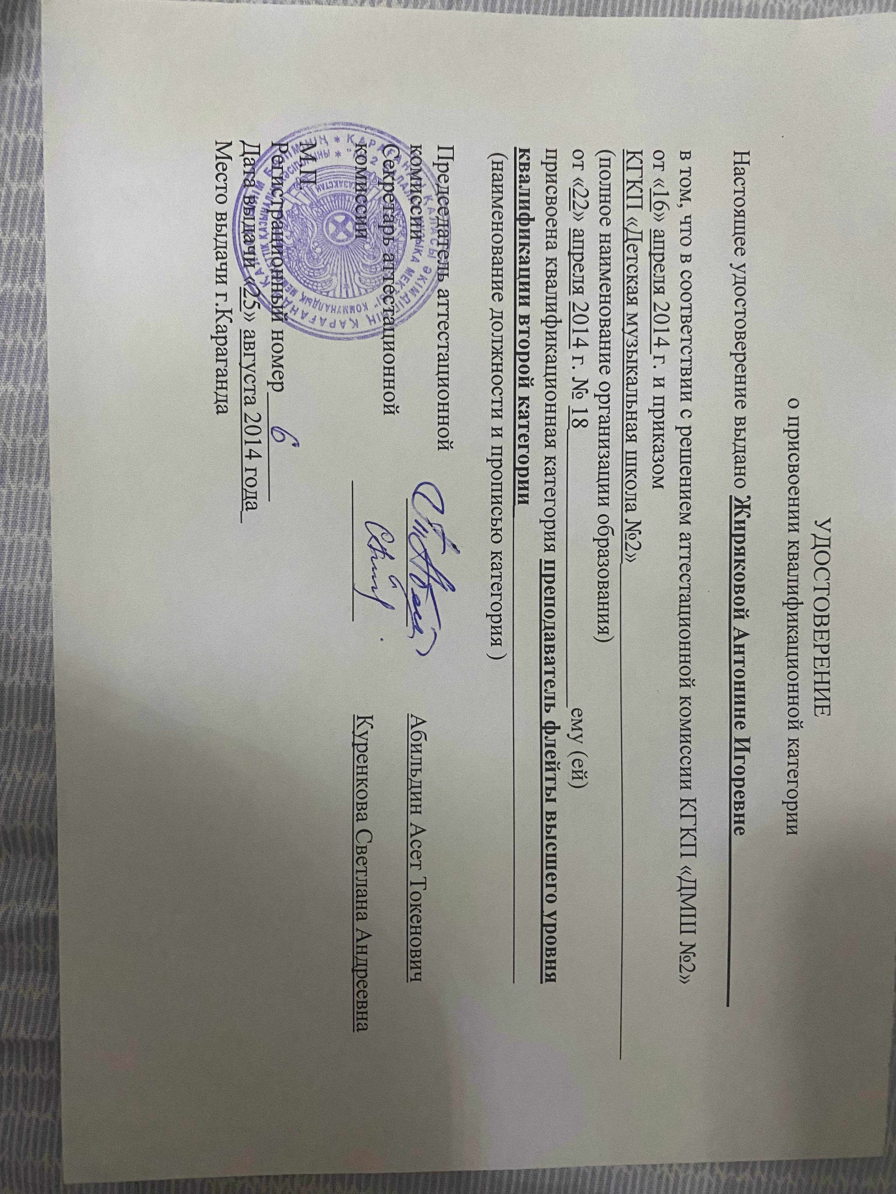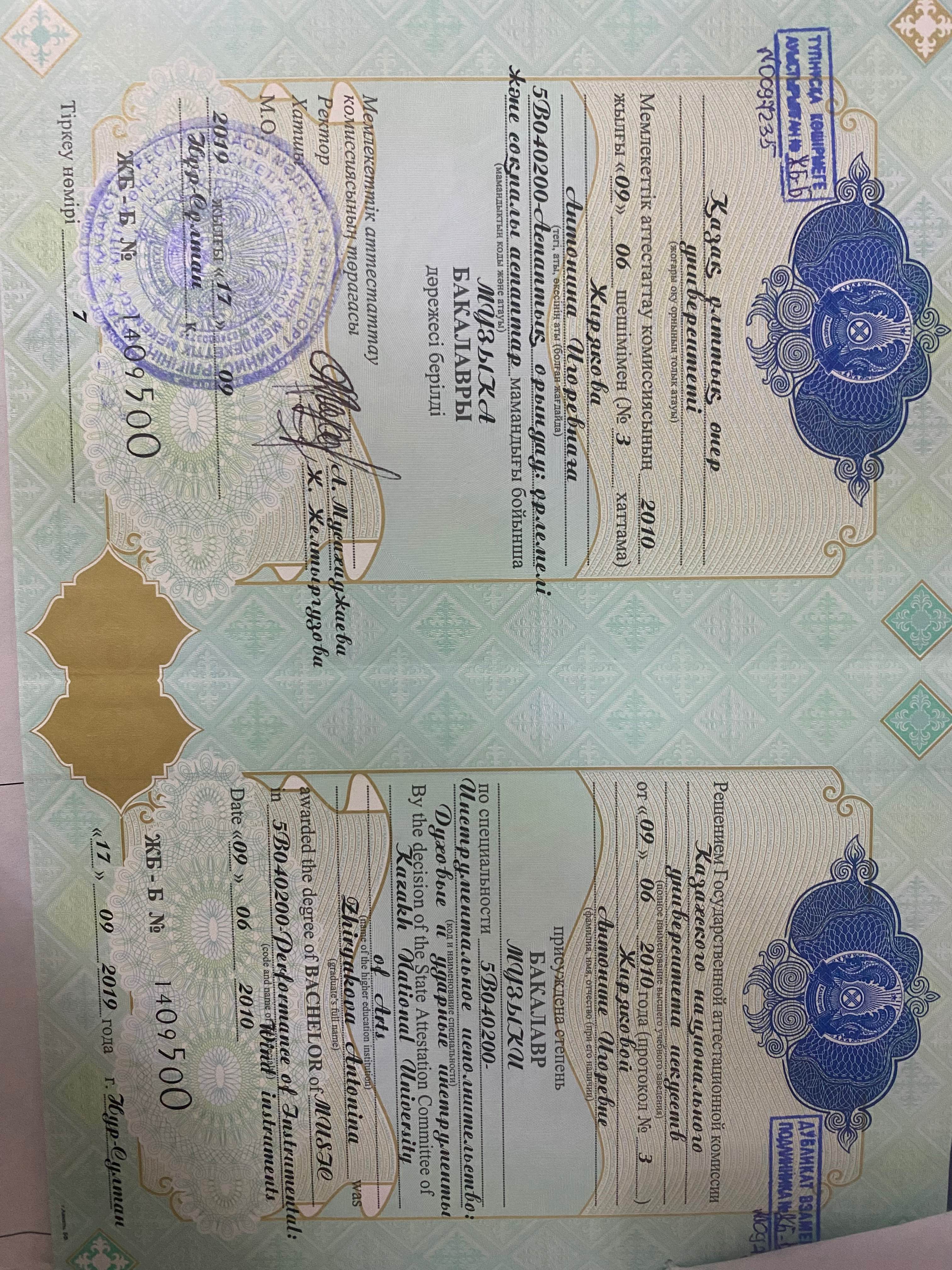 - Образование: Казахский Национальный Университет Искусств, "Инструментальное исполнительство. Духовные и ударные инструменты", бакалавр, 2010 год.