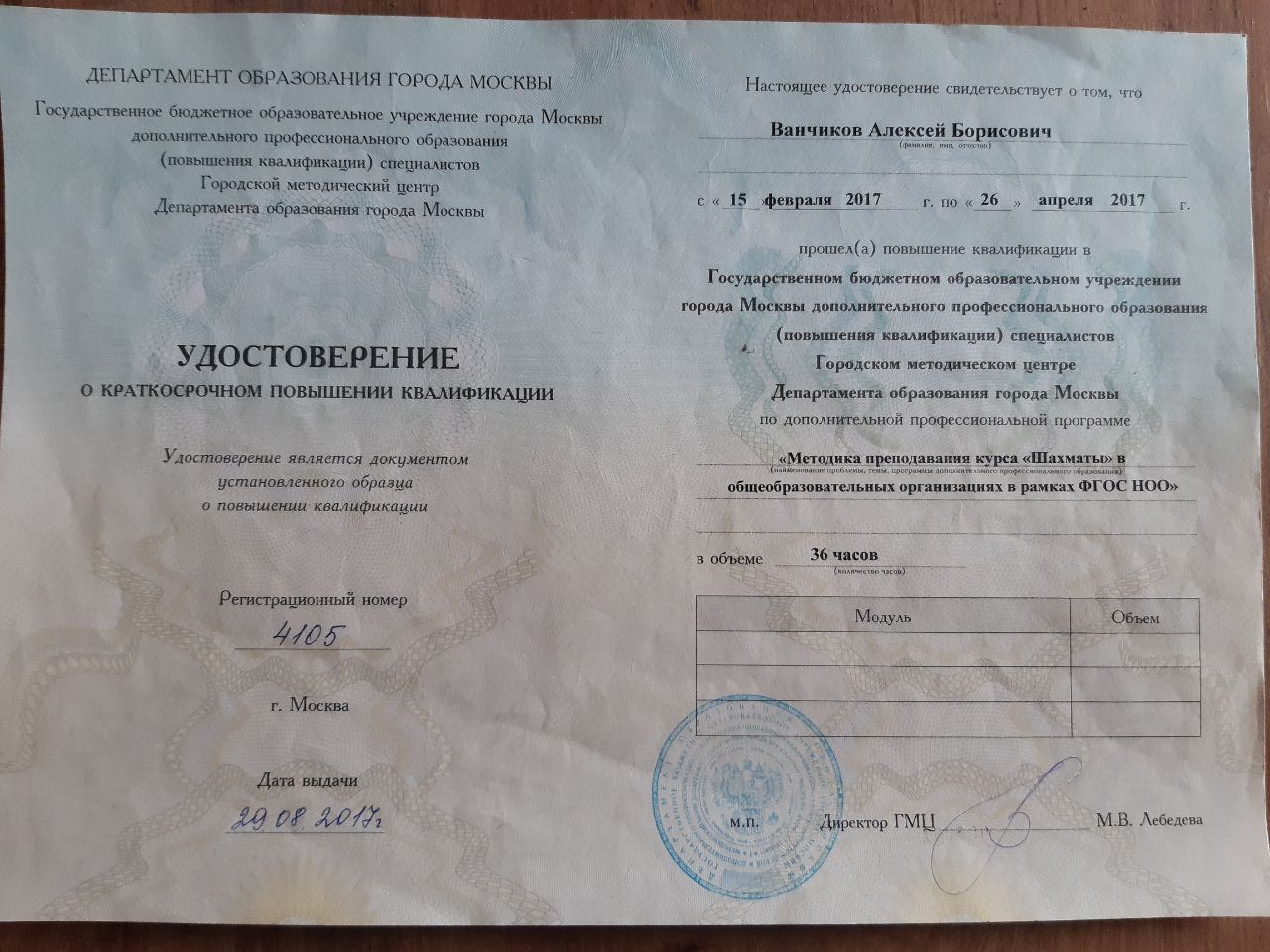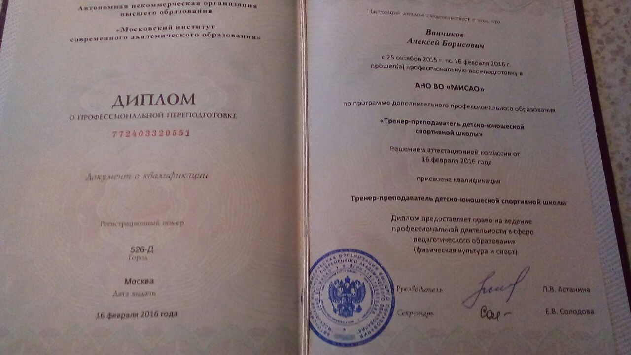 Диплом о профессиональной переподготовке, МИСАО, тренер-преподаватель ДЮСШОР, 2016 год.