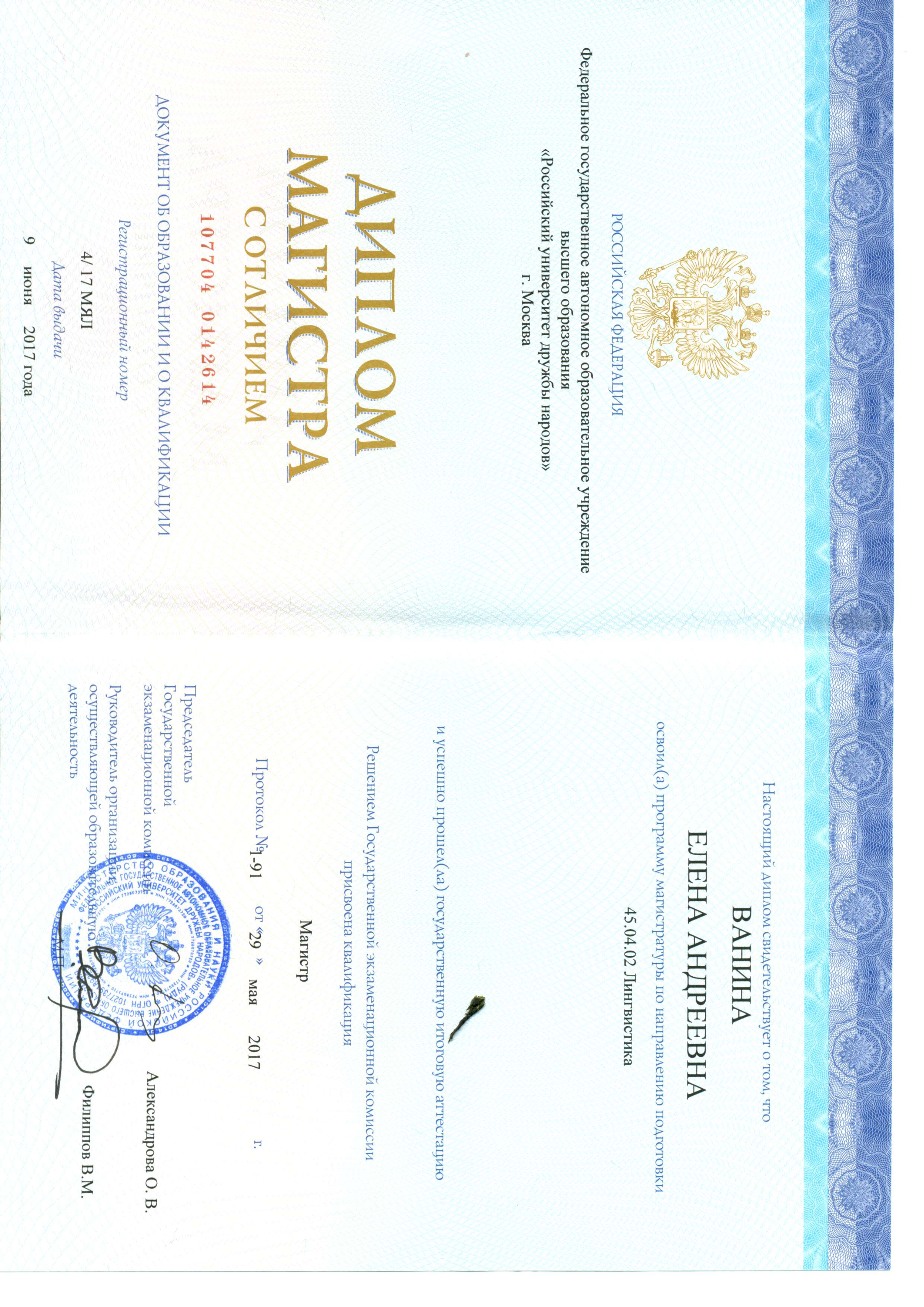 Образование: Российский Университет Дружбы Народов (РУДН), Институт Иностранных Языков, направление «Лингвистика», магистр, 2017 год.