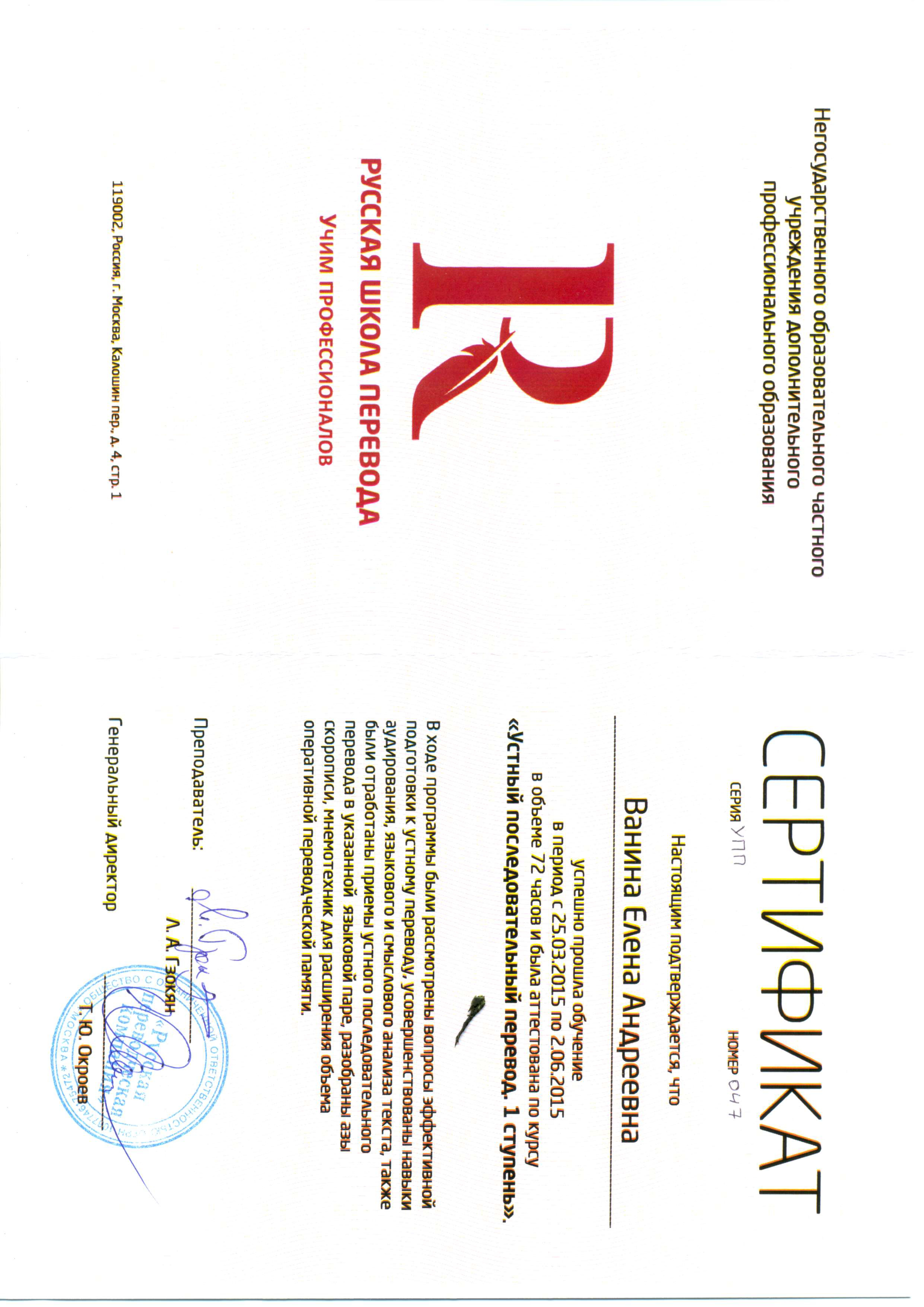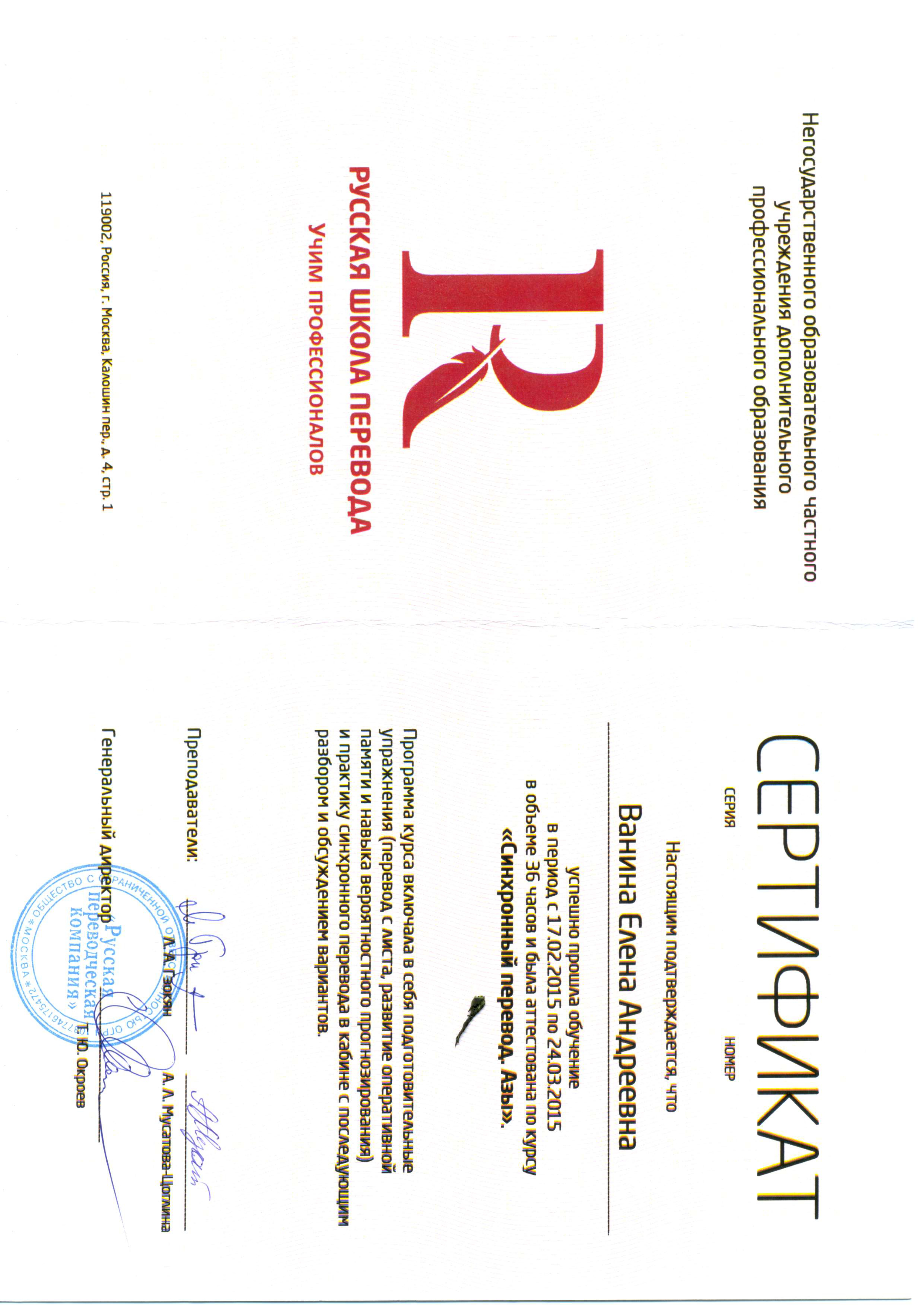 Профессиональная переподготовка: учебный центр русского языка Московского Государственного Университета, "Методика преподавания РКИ". Русская школа перевода, "Устный последовательный перевод. Синхронный перевод"....