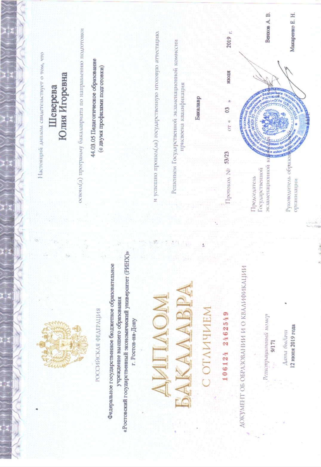 - Образование: Высшее, Ростовский Государственный Экономический Университет, педагогическое образование с двумя профилями подготовки (история и обществознание), бакалавр, 2019 год.