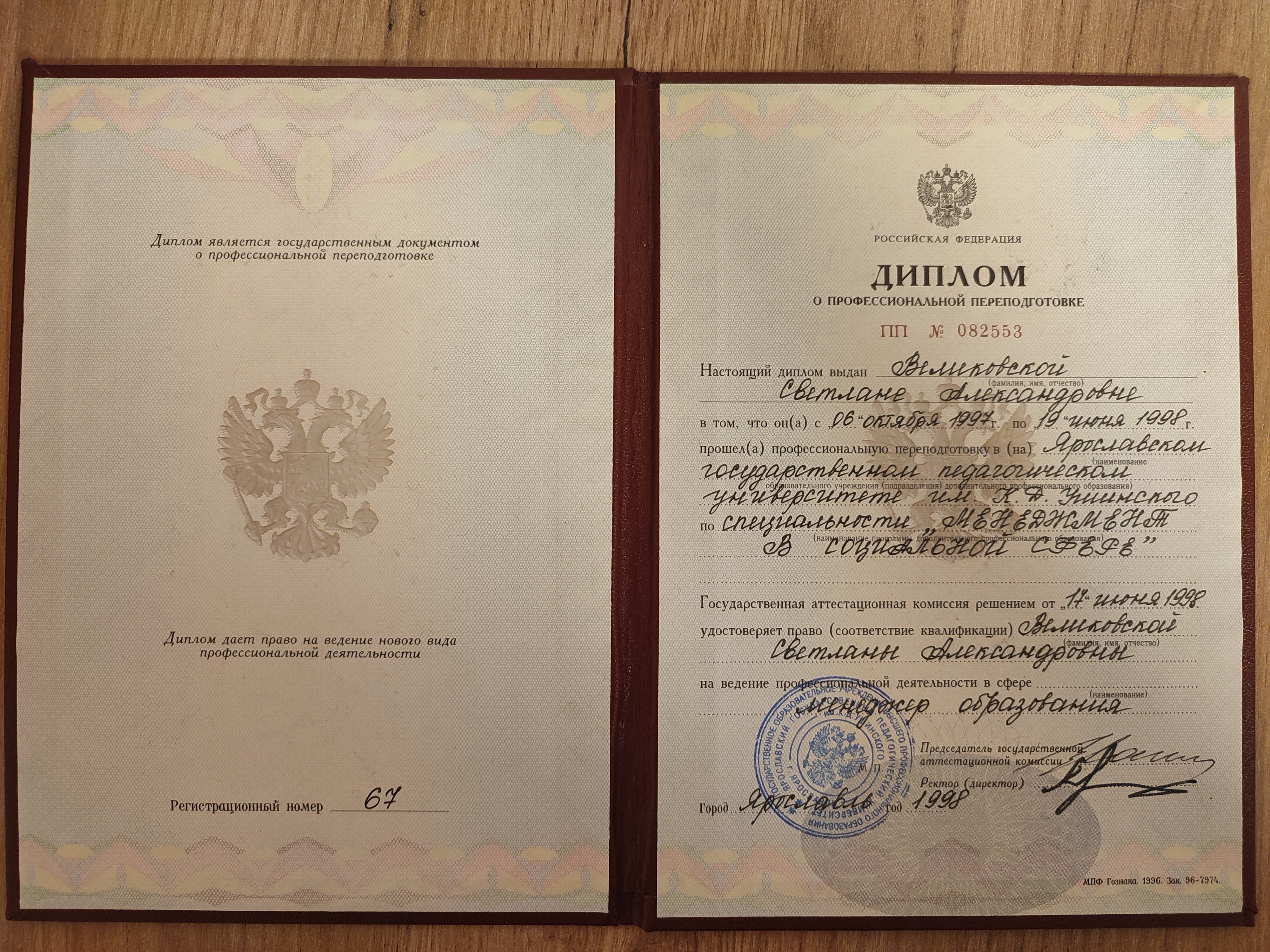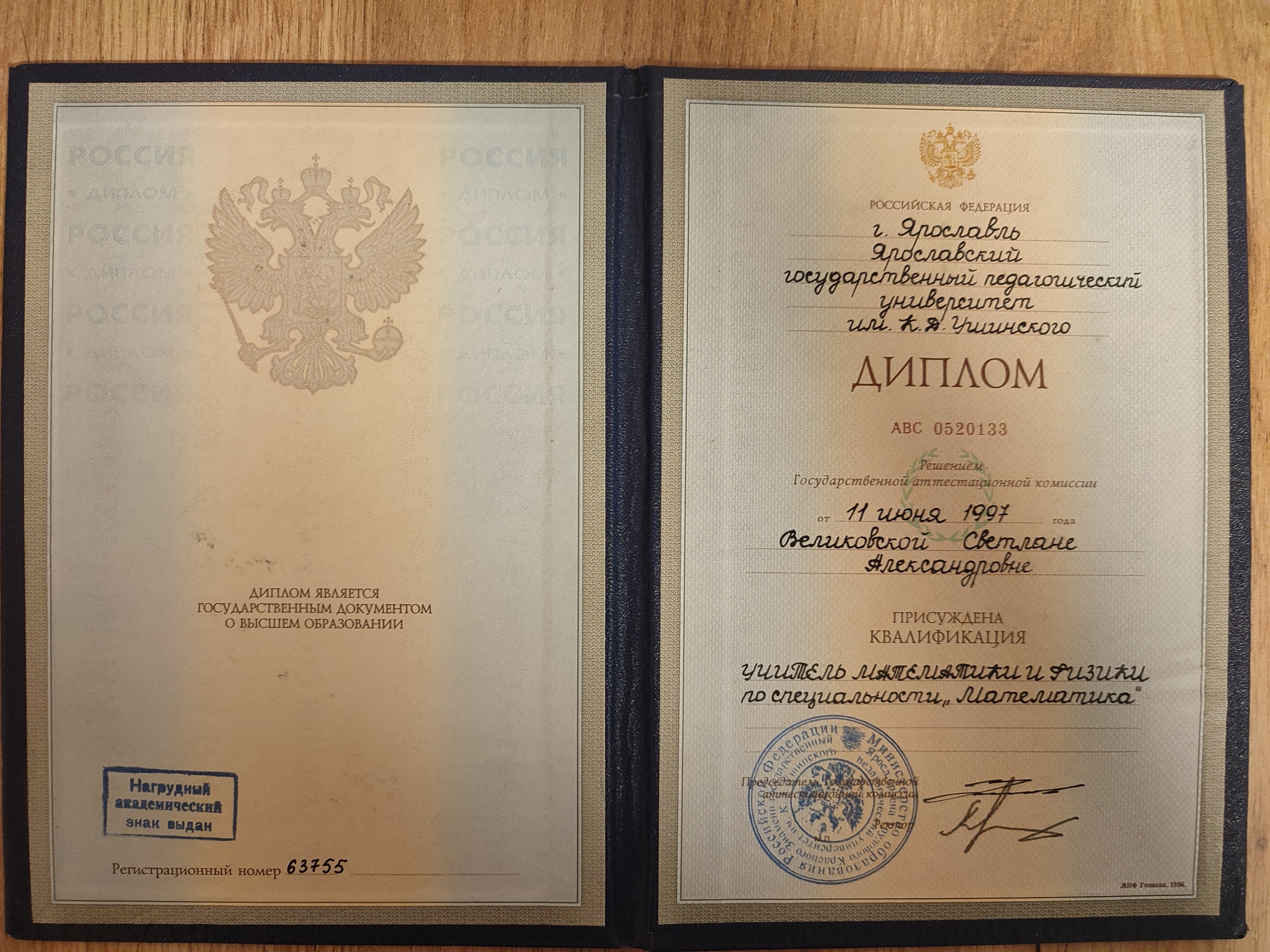 - Образование: ЯГПУ имени К. Д. Ушинского, "Учитель математики и физики", специалист, 1997 год.