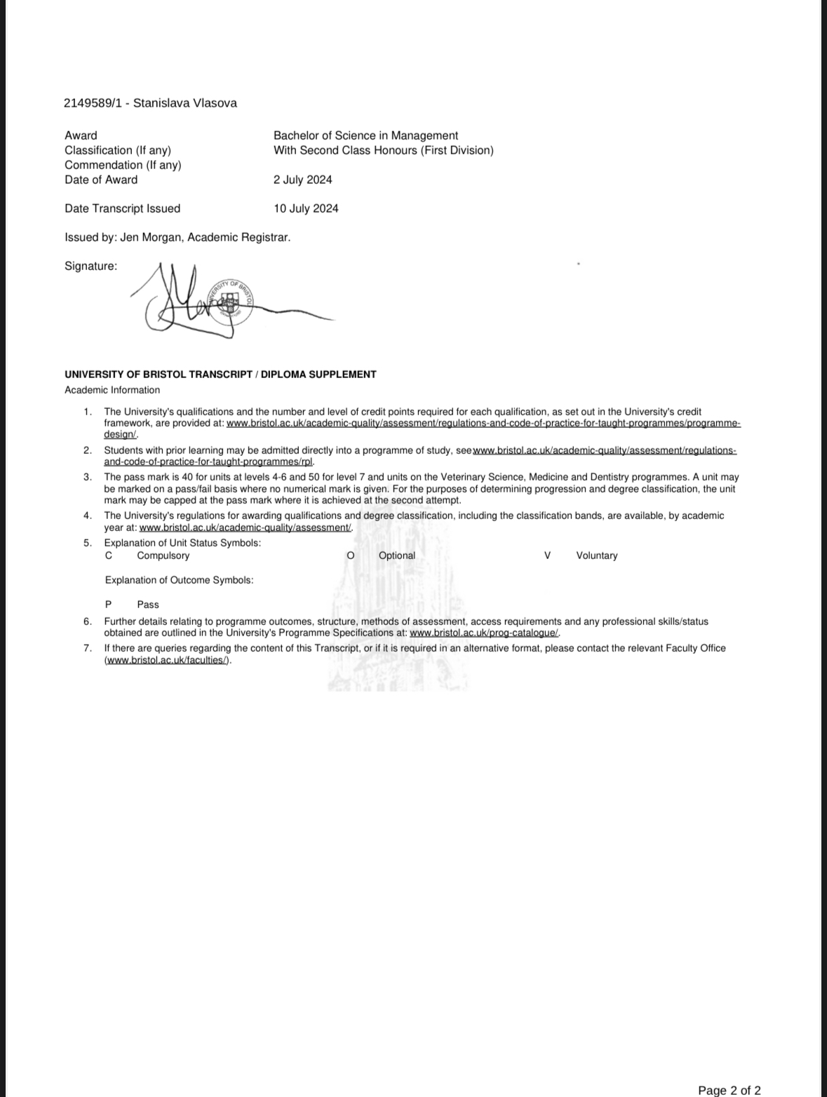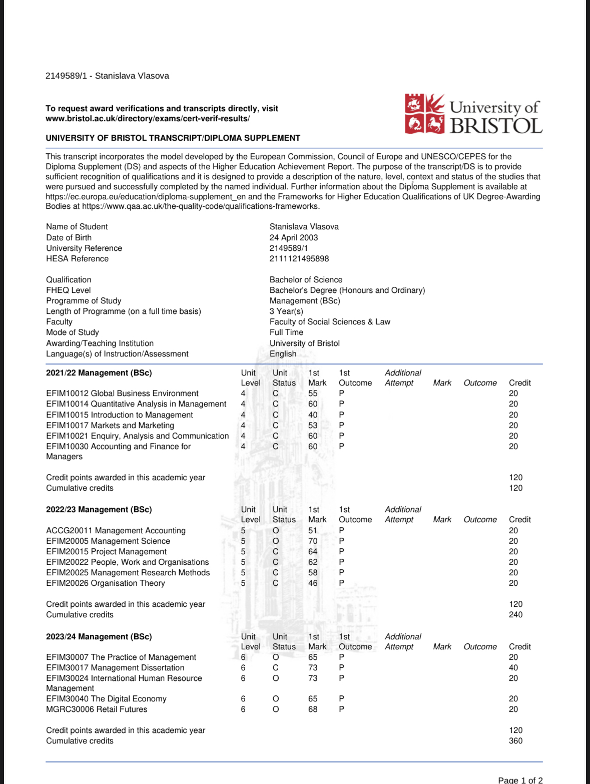 - Образование: Бакалавр, диплом с отличием по бизнесу и менеджменту, Университет Бристоля, 2024 год.