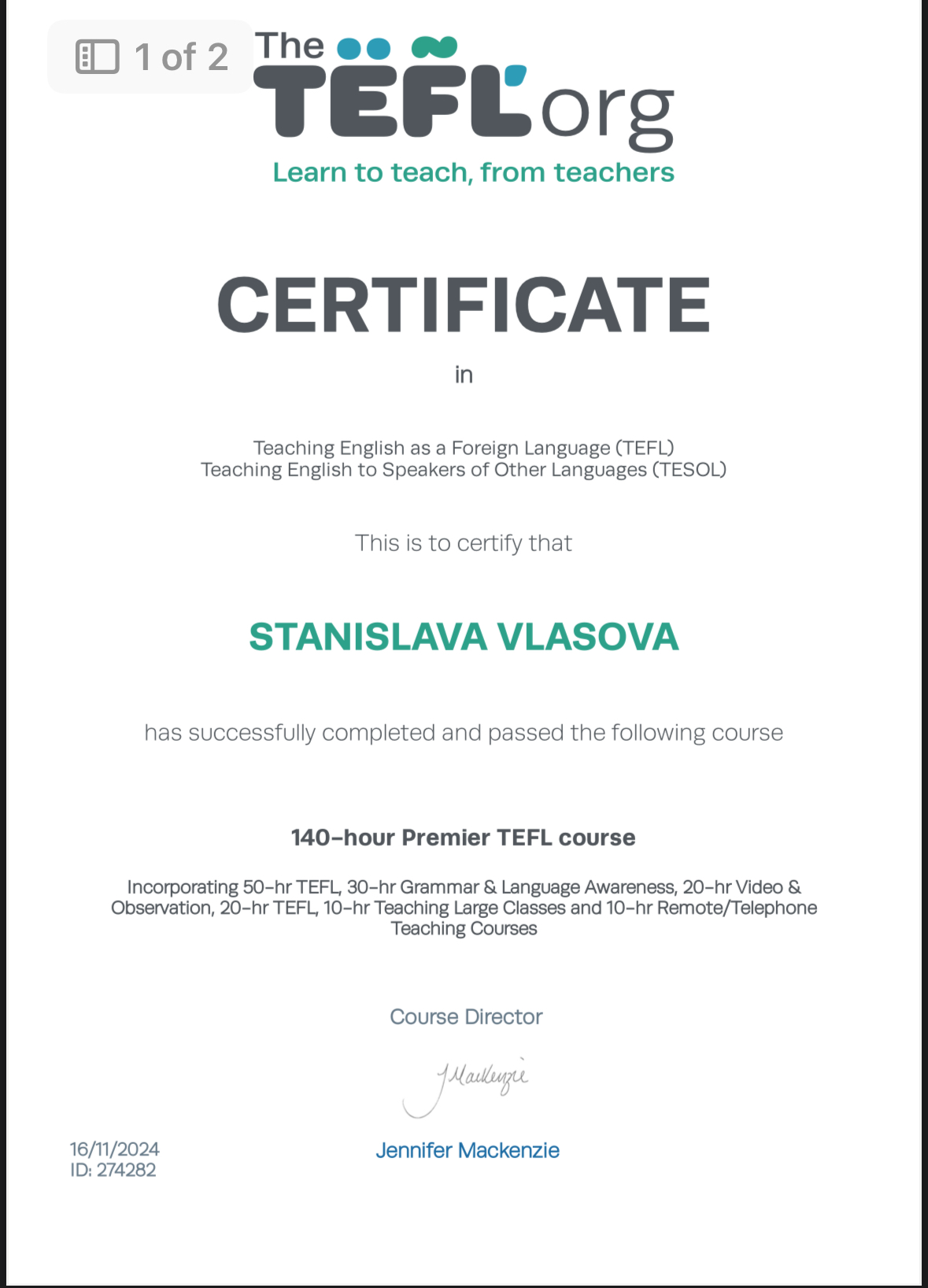 Мой родной язык русский. С 11 лет я обучалась в частной школе "the Leys" в Кембридже. Окончила университет в Бристоле. Владею английским языком в совершенстве и разговариваю с британским акцентом. Я окончила курс преподавателя "TEFL" в Англии.