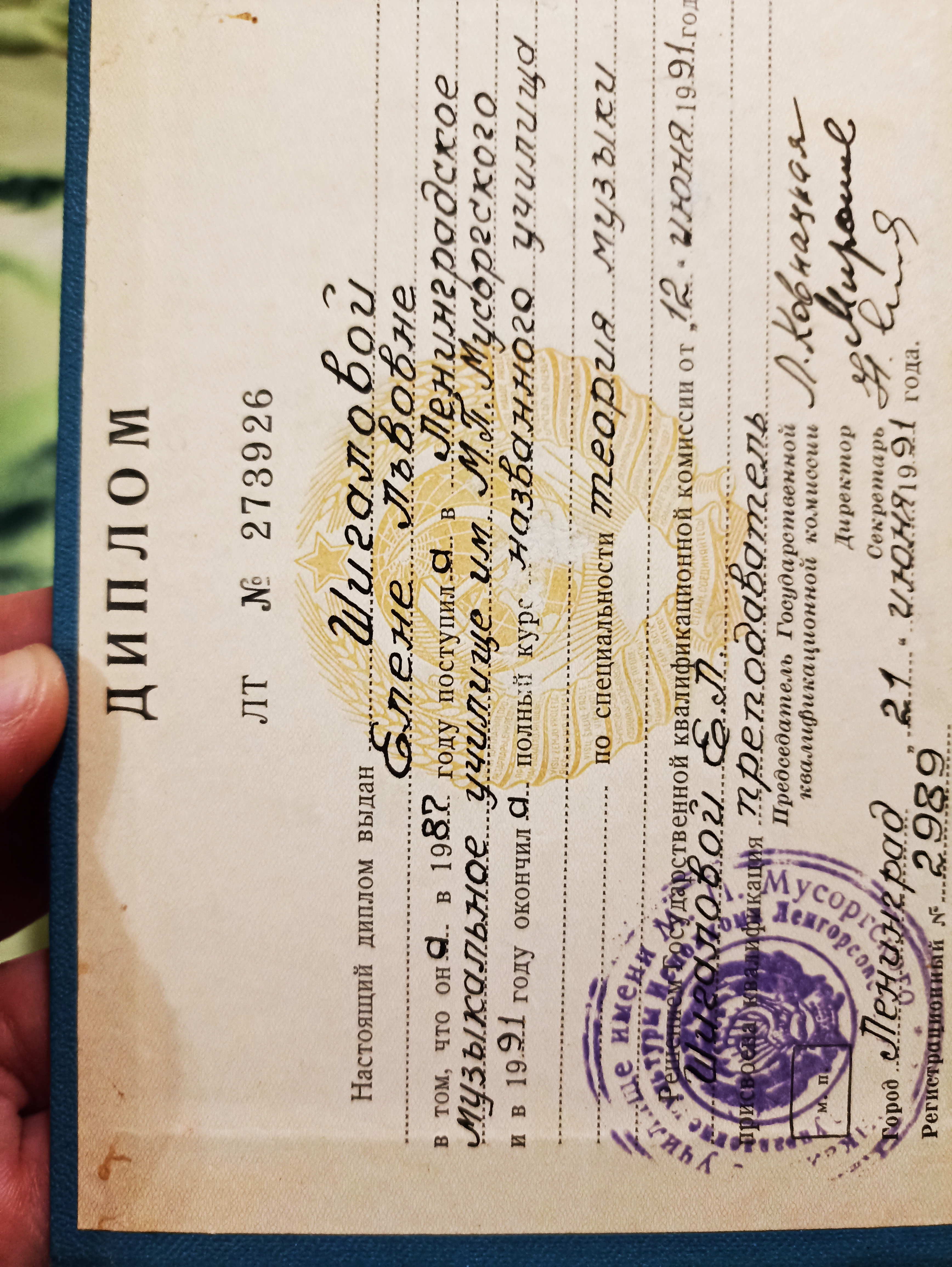 Образование: Ленинградское Музыкальное Училище имени Мусоргского, теория музыки, 1991 год.