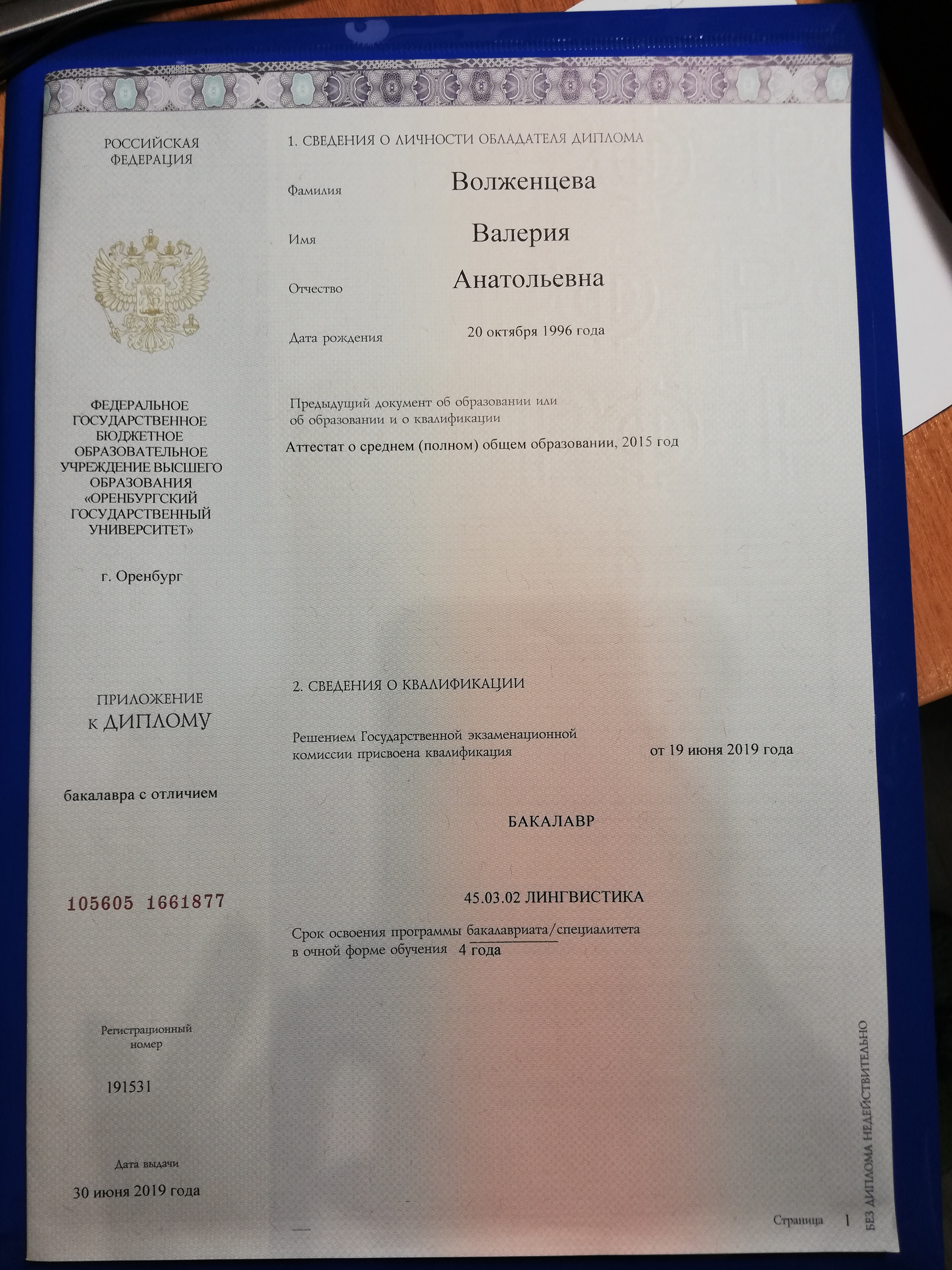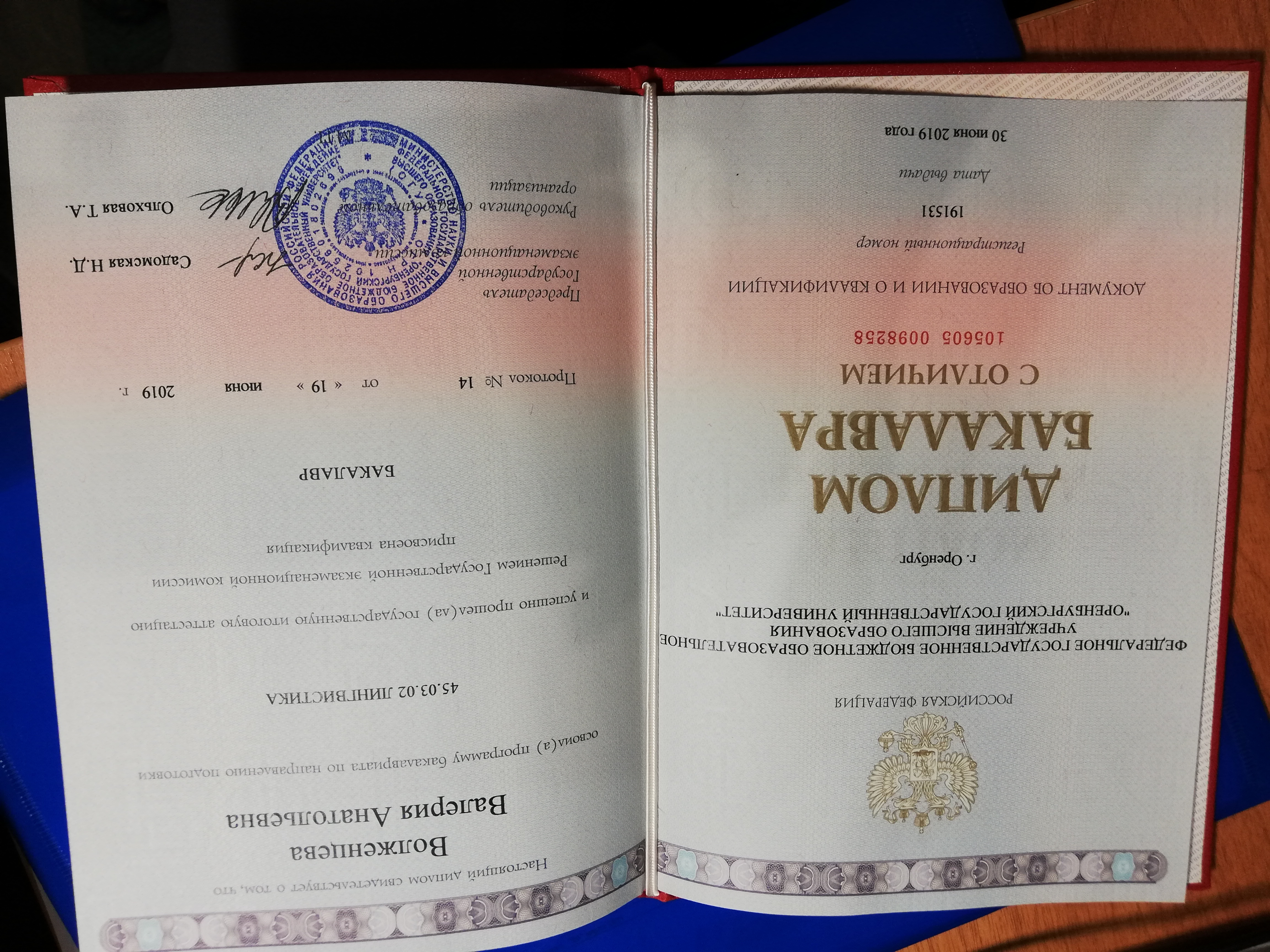 Образование: Оренбургский Государственный Университет, специальность "Лингвист-переводчик", диплом с отличием, бакалавр, 2019 год.