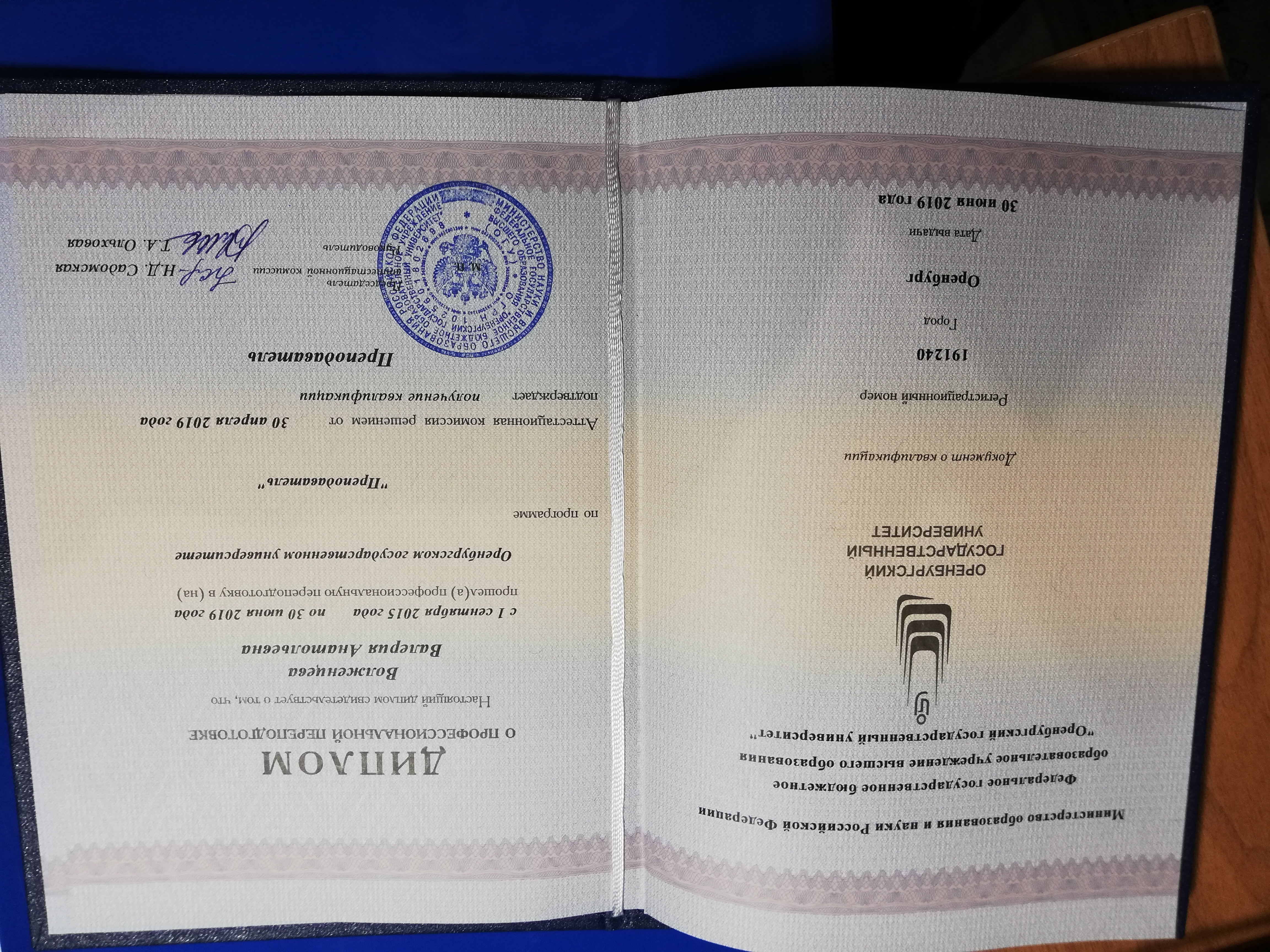 Диплом о профессиональной переподготовке, преподаватель, 2019 год.