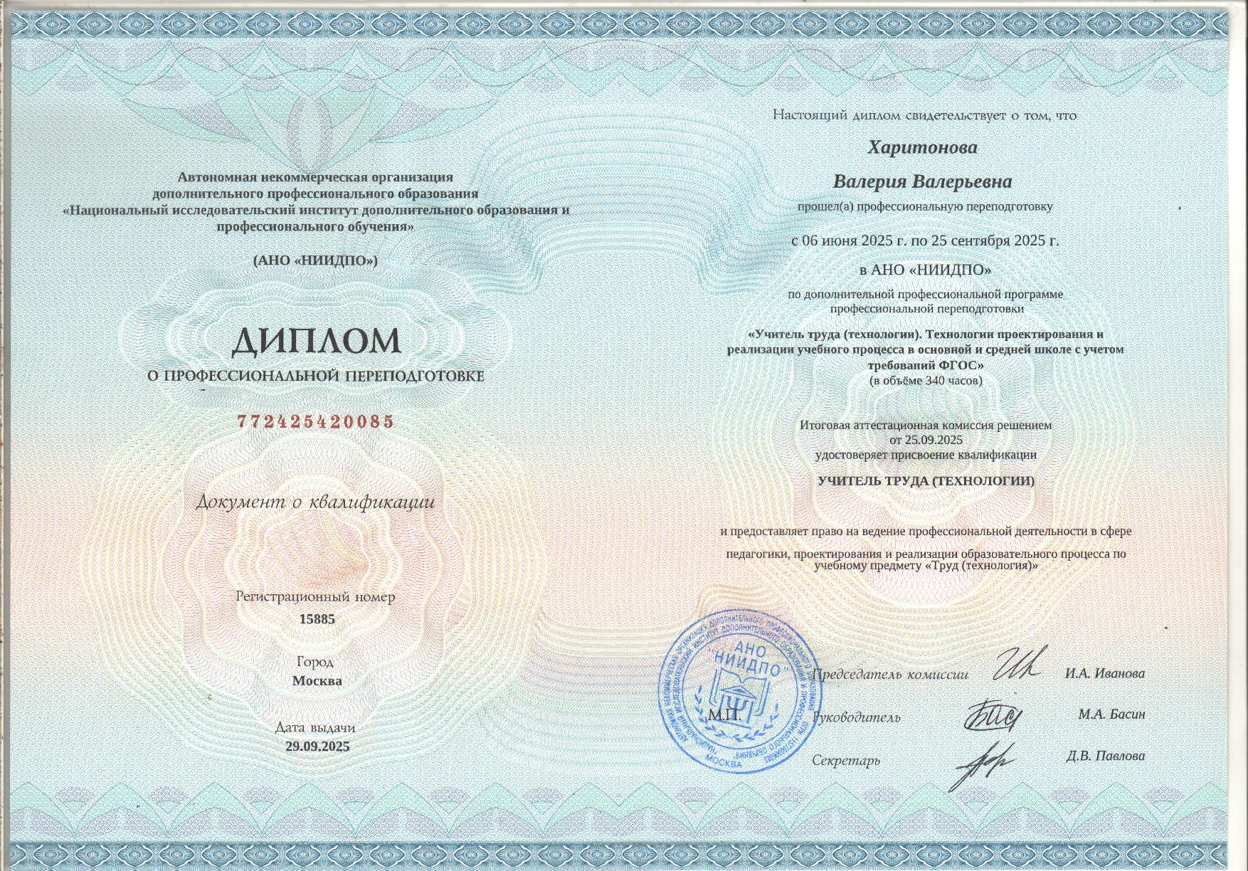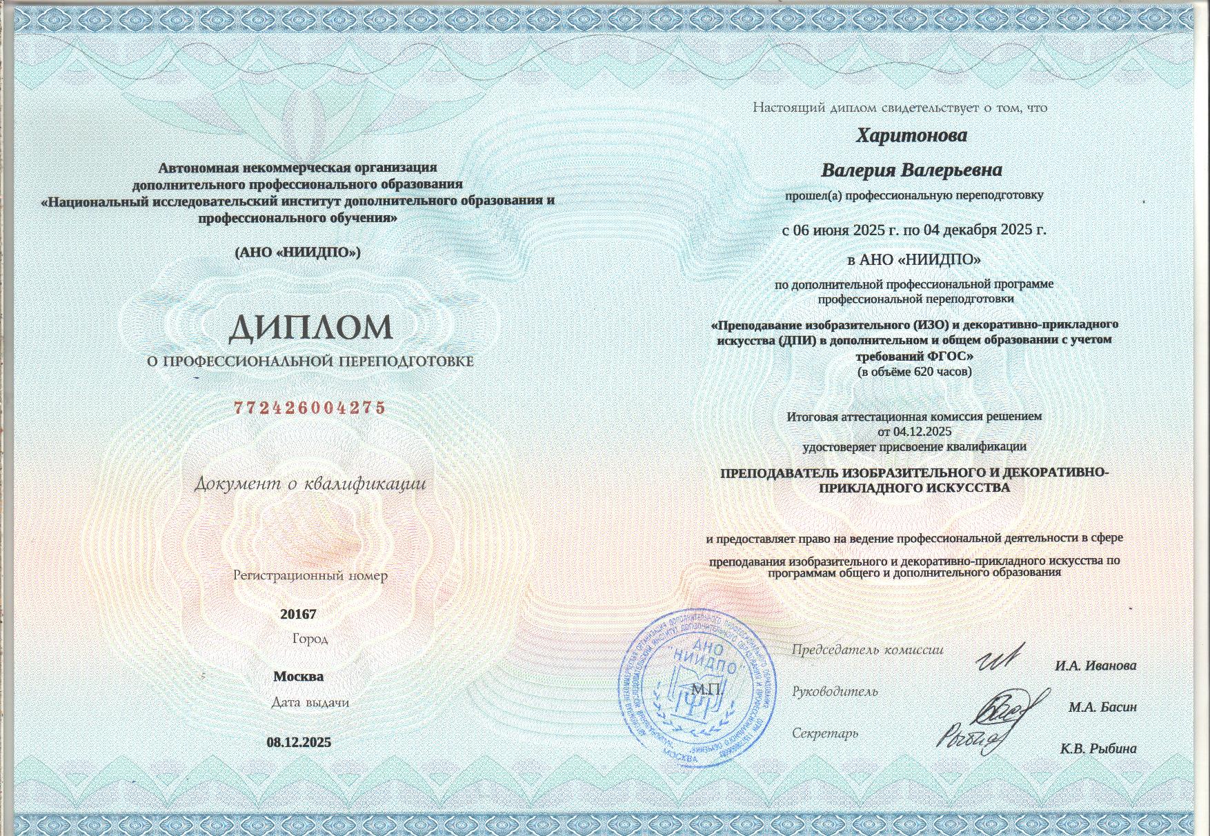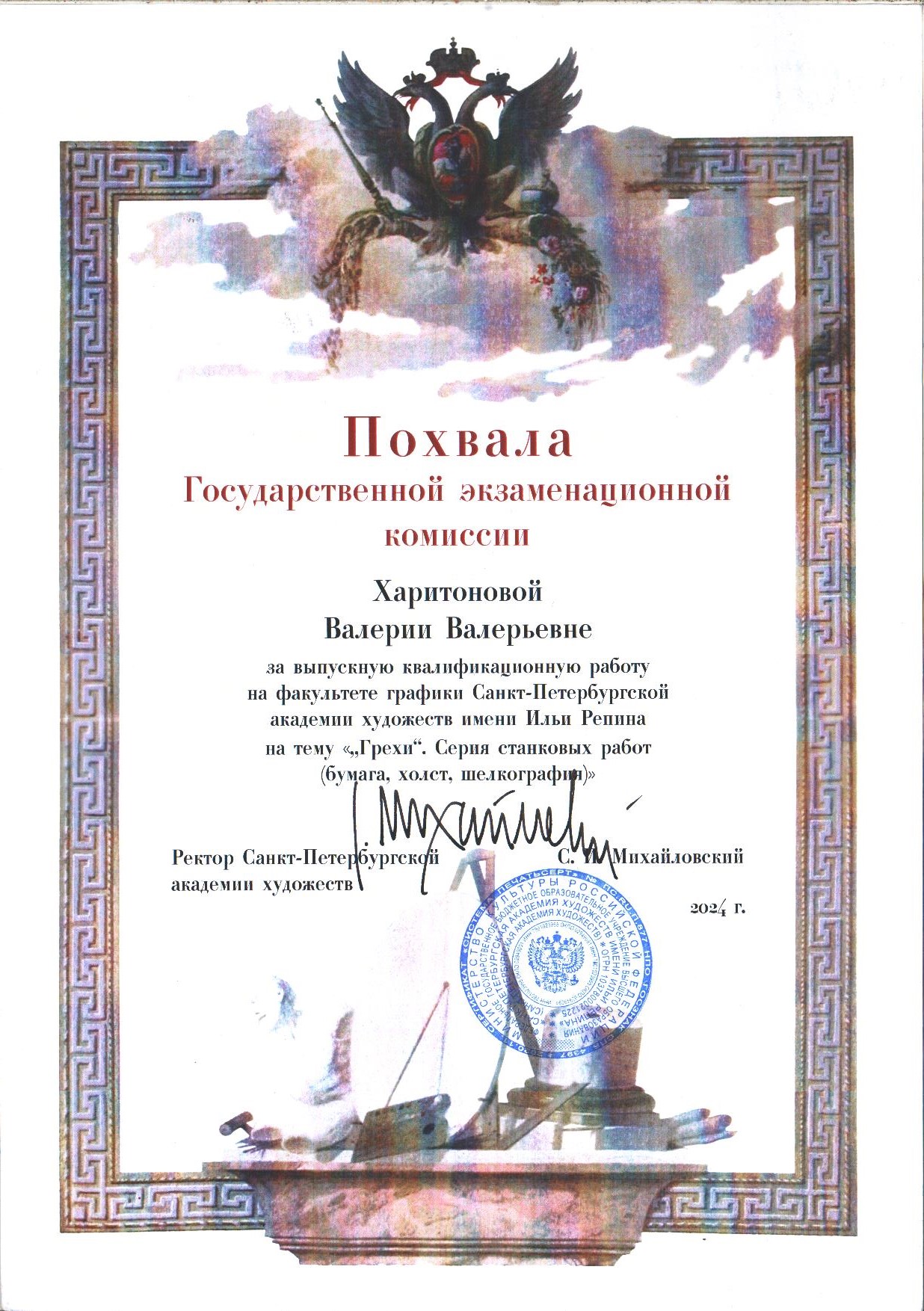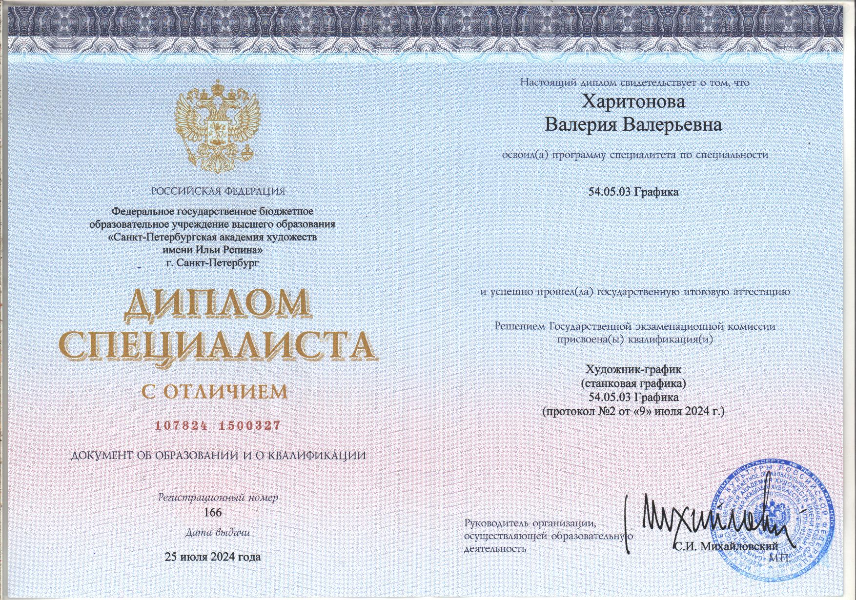 - Образование: Академия Художеств имени И. Е. Репина (Санкт-Петербург), факультет графики, художник-график, специалист, диплом с отличием, 2024 год.