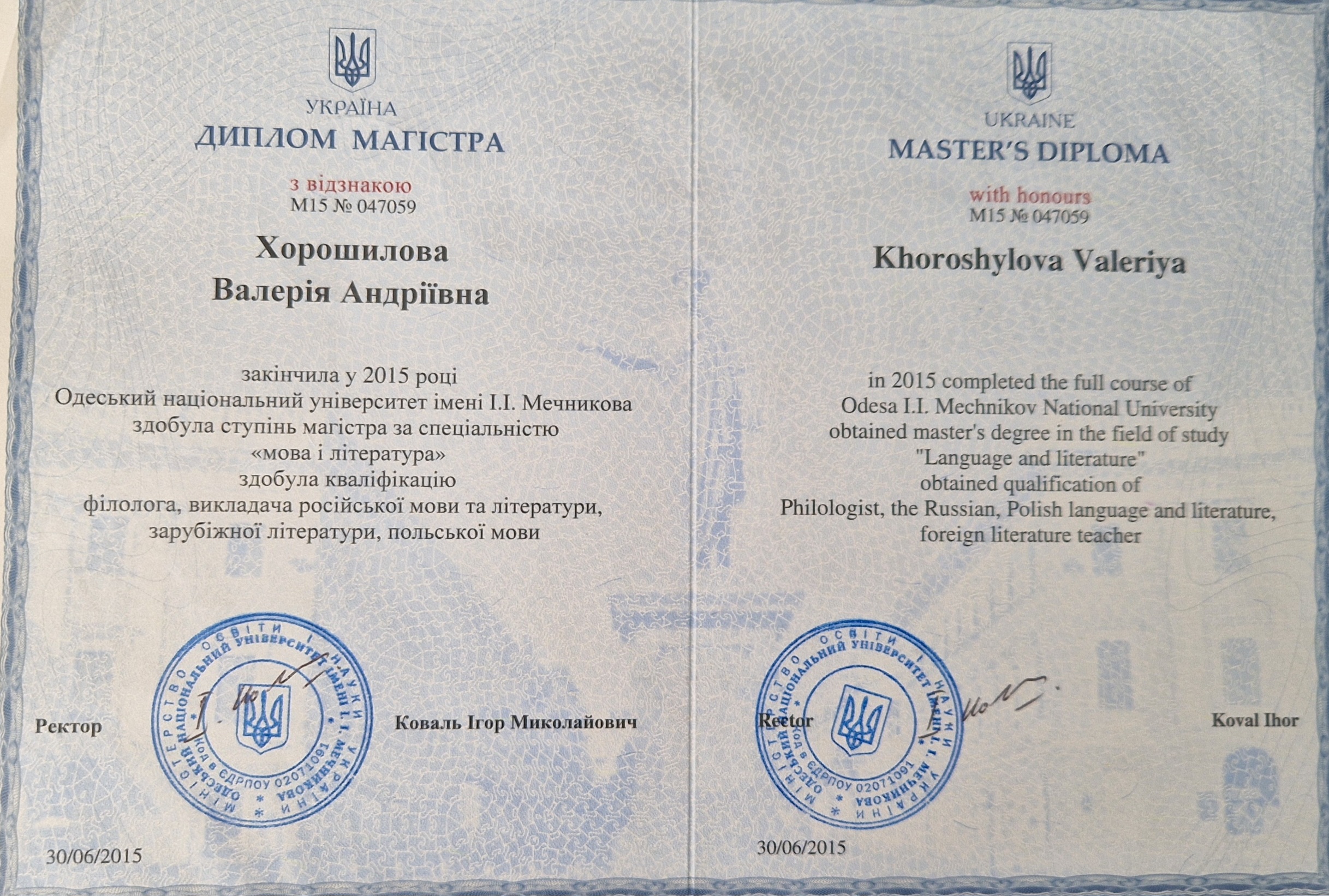 - Образование: Одесский Национальный Университет имени И. И. Мечникова, филолог русского языка и литературы с правом преподавания польского языка (бакалавр 2014 год, магистр 2015 год).