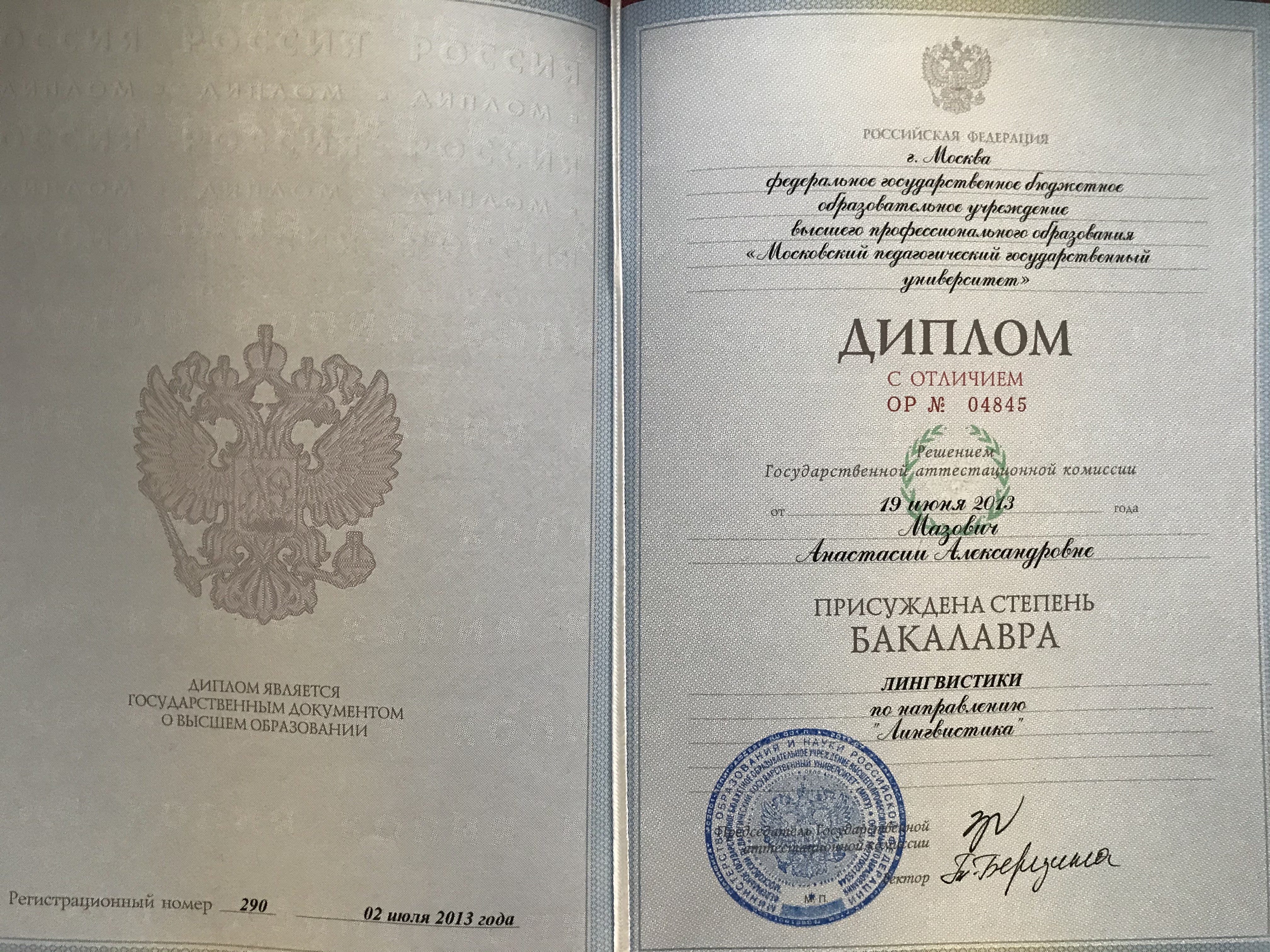 Образование: МПГУ (город Москва), "Лингвистика", диплом с отличием, бакалавр, 2013 год.